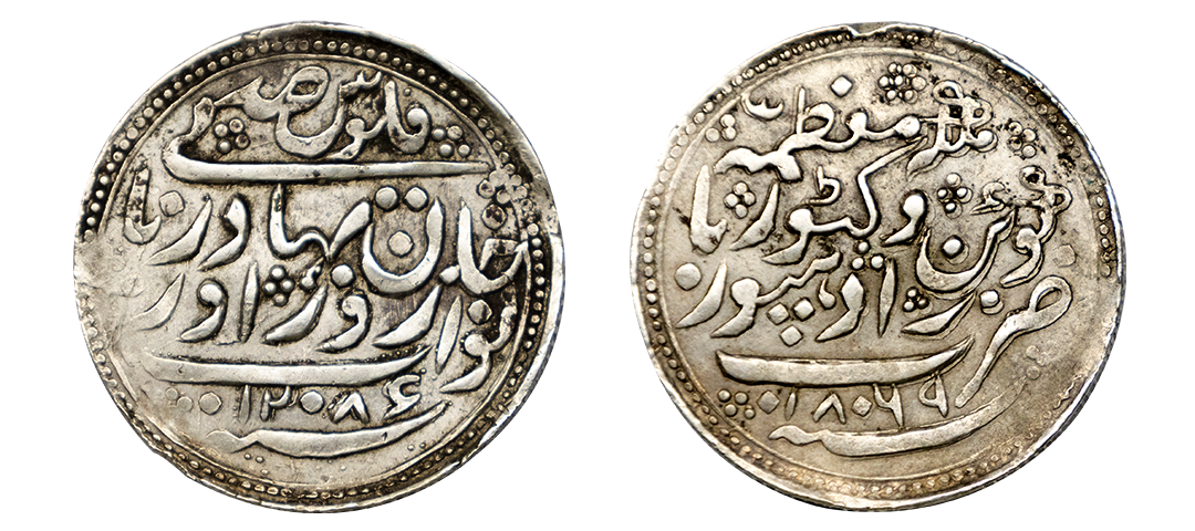 Jaipur State, Sawai Jaipur Mint, Silver Nazarana Rupee, AH 1166/6 RY, In the name of Ahmad Shah Bahadur, Obv: Persian legend "Sikka Mubarak Badshah Ghazi Ahmad Shah Bahadur", Rev: Persian legend "Sana 6 julus" & "zarb Sawai Jaipur" at the bottom, (KM #9), graded by NGC as AU58, Very Rare.