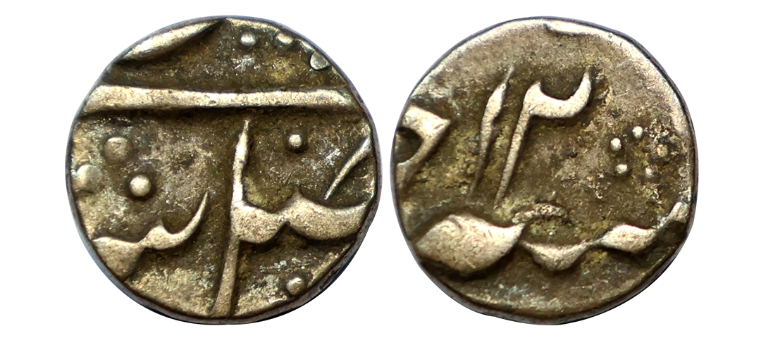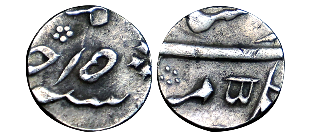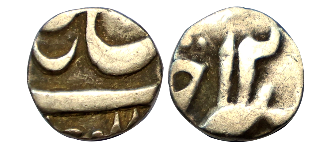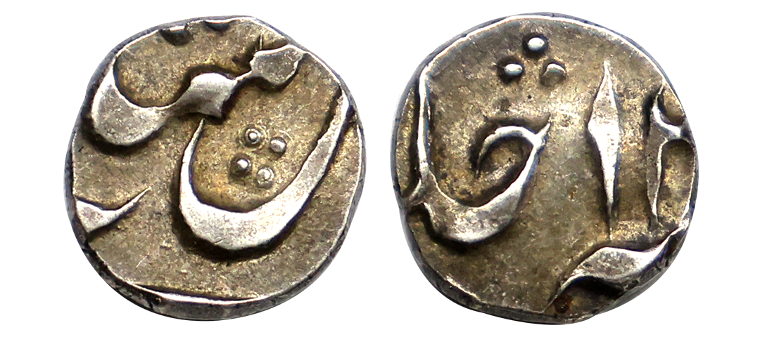 Madras Presidency, Silver ¼ Pagoda, 1818, Obv: a seven-tiered gopuram of a temple, on stony ground, between 9 stars on each side, bordered by a buckled garter containing the value "QUARTER PAGODA" in English and Persian, all within a beaded border partially visible, Rev: a figure of Vishnu usually holding a sword in his left hand and rising from a lotuser, dotted and other symbols on each side within two beaded circles, all within this ribbon containing the value in Tamil and Telugu, graded as AU 55 by PCGS, very rare.