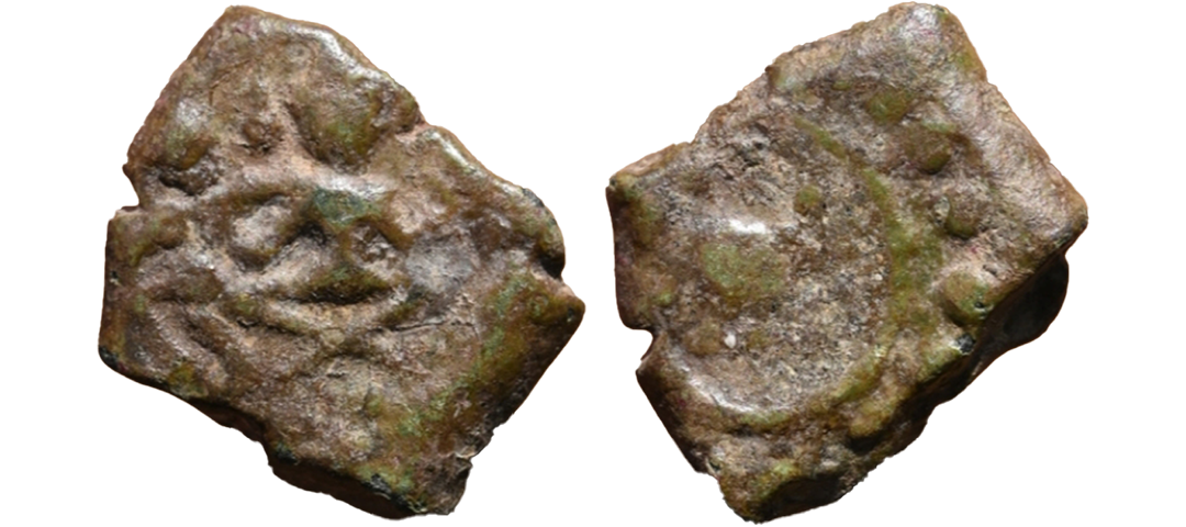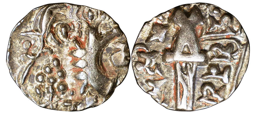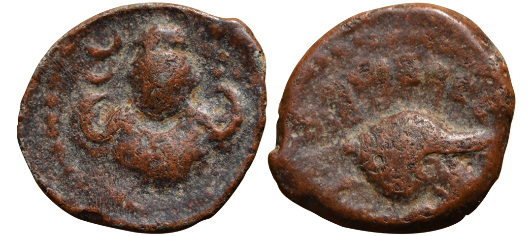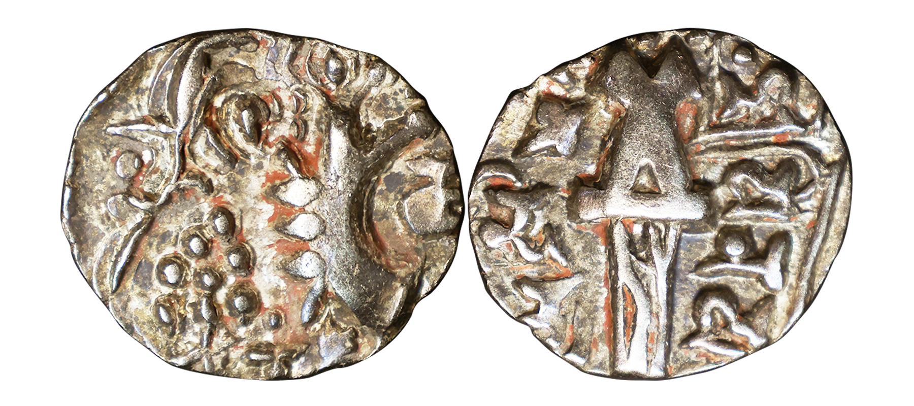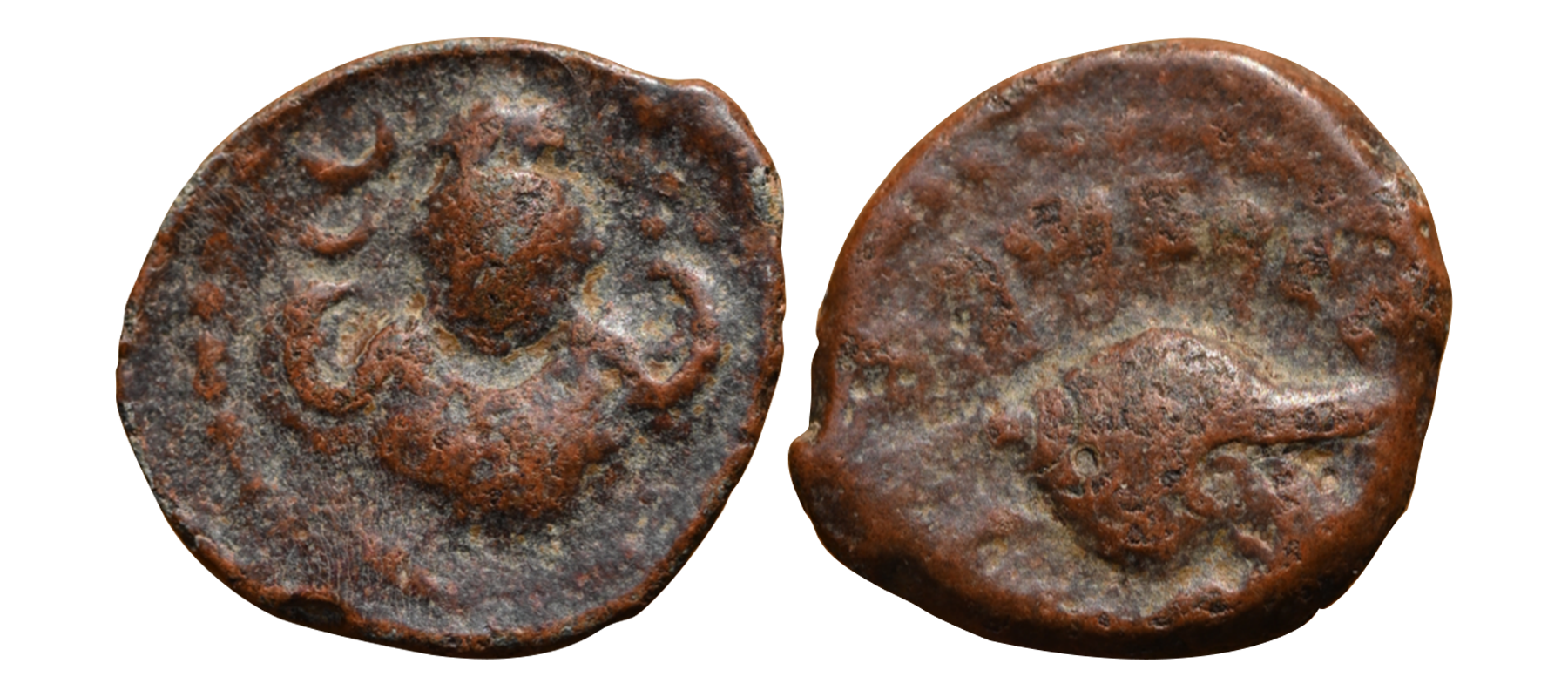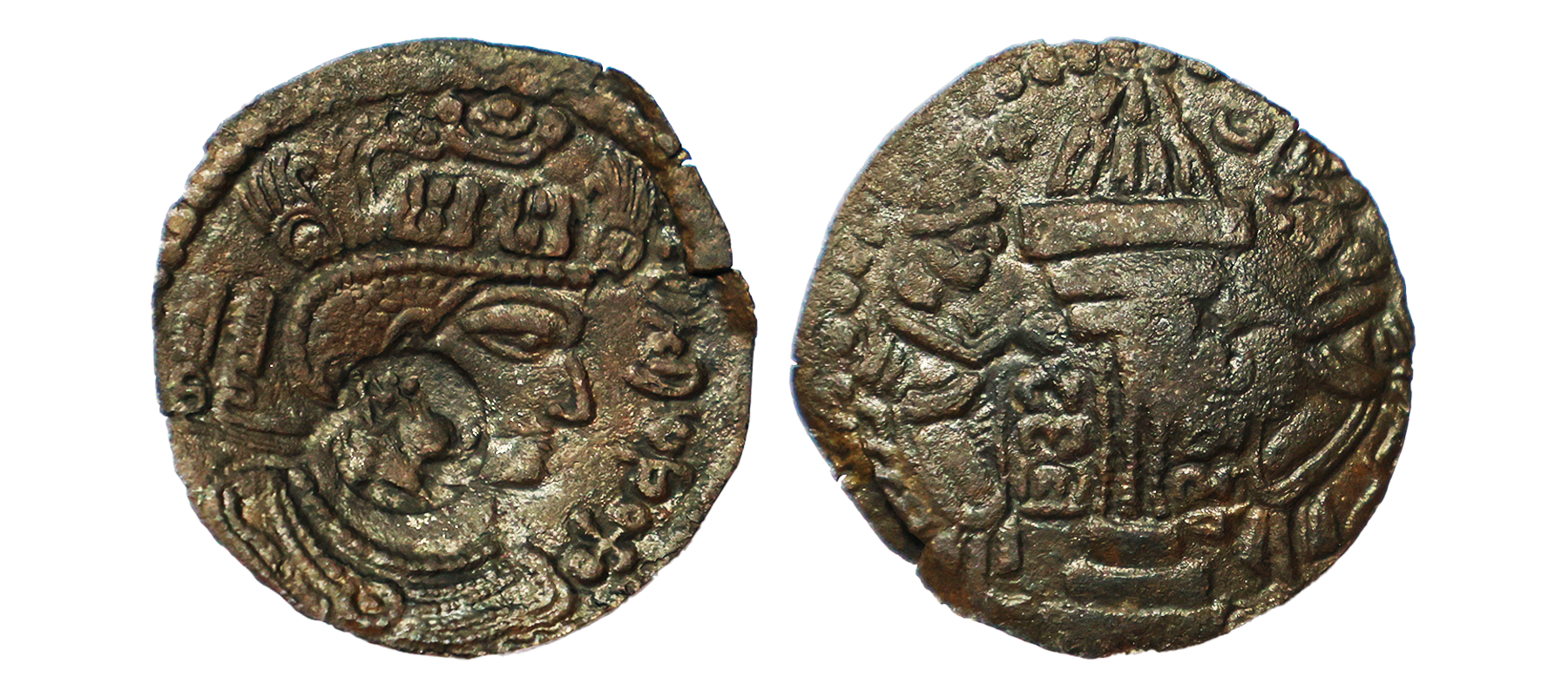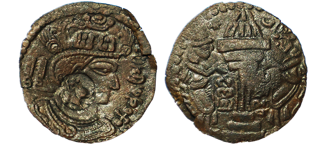 Hunnic Tribes, Western Turks, Shahi Tegin(Sri Shahi)( 680-700 AD), Copper Drachm, 2.63 gms, Uncertain Mint in Khorasan, Obv. Draped bust of Tegin to right, wearing winged crown surmounted by double crescent, ‘σριο τογινο βαyo’ ('His Perfection, Tegin, King' in Bactrian), Rev. Fire altar flanked by two winged attendants with headdresses leaning toward the altar and placing their hands on it Brahmi legends ‘Srima Deva Pattasri’(Sri made by God’s perfection) visible on the fire altar shaft, Gobl Type 206, choice extremely fine, very rare. Tegin was the King of Turk Shahis, a dynasty of Western Turk or mixed Western Turk-Hephthalite origin who ruled from Kabul and Kapisa to Gandhara in the 7th to 9th centuries. The reverses of the drachms of Tegin of Khorasan are perhaps the most elaborate and detailed in all of the Hunnic Western Turkish series. While the winged attendants flanking the fire altar are sometimes described as Kinnaras, mythical half-man and half-bird creatures. Note: Only 3-4 specimen sold globally with Boar countermark, being offered for the first time in any Indian Auction.