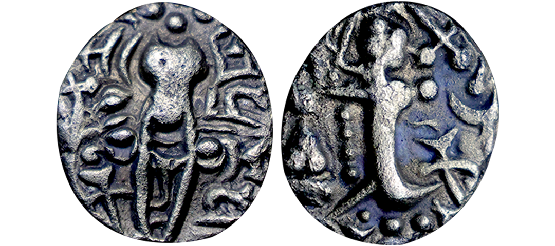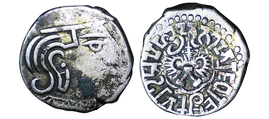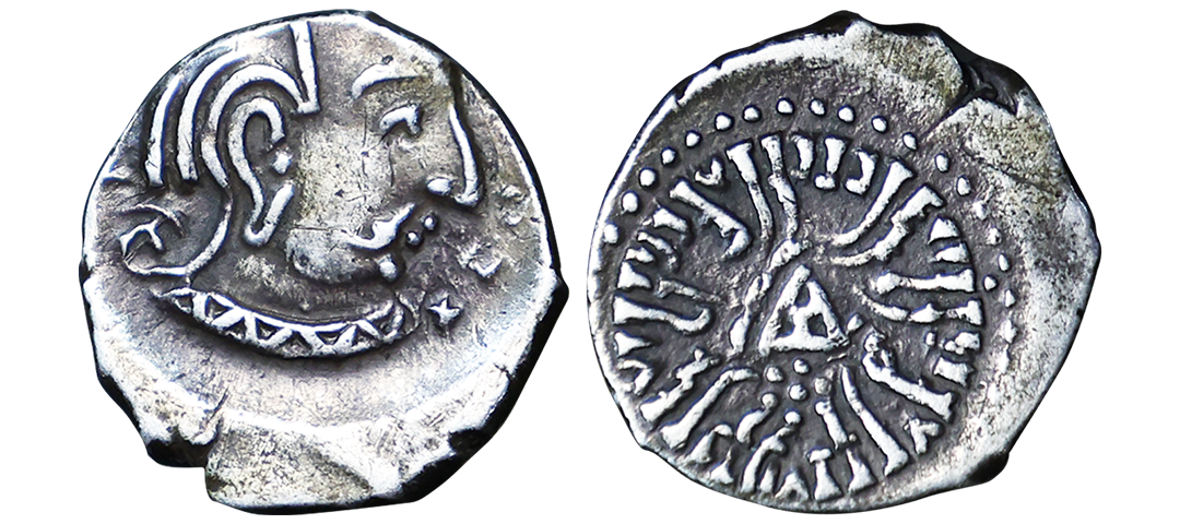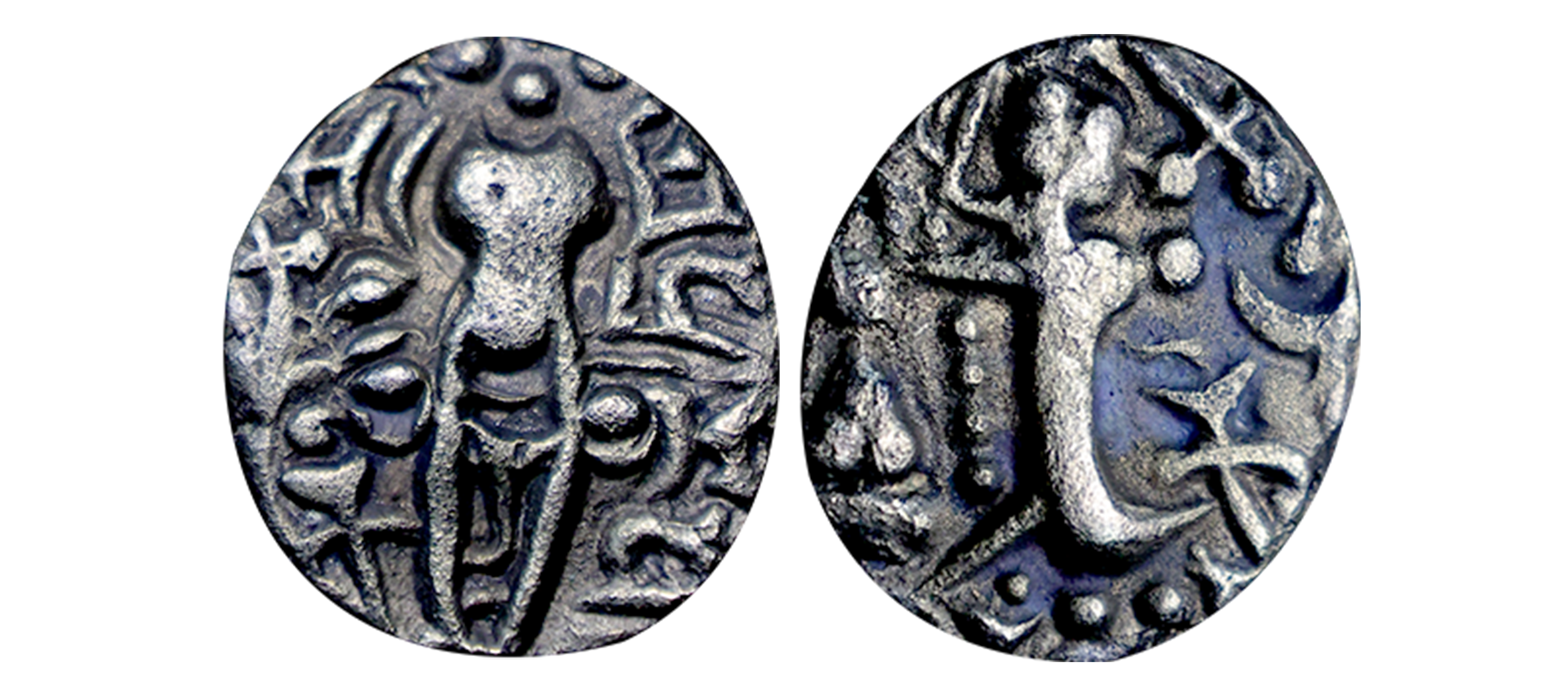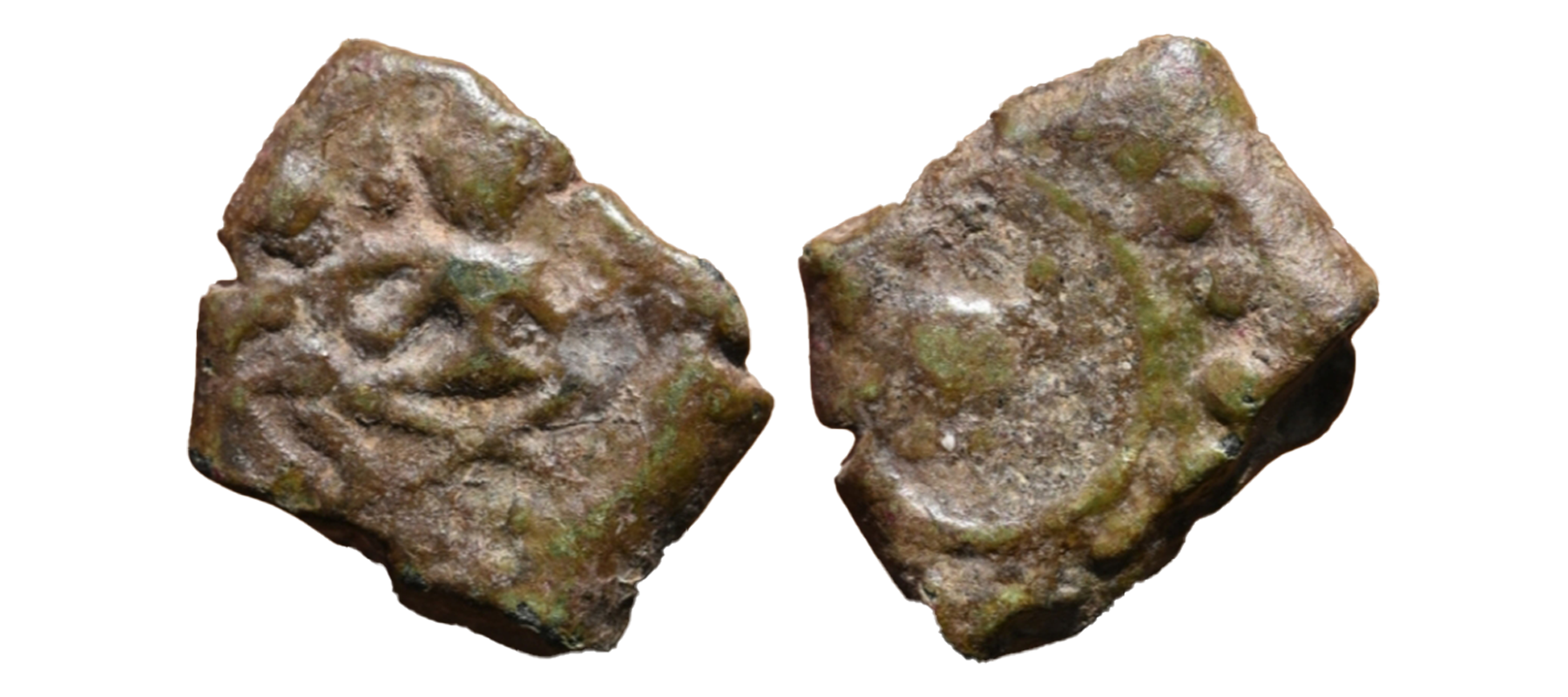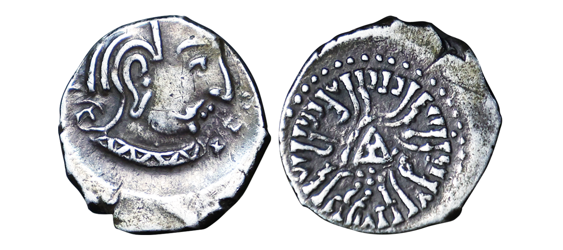 Hunnic Tribes, Western Turks, Shahi Tegin(Sri Shahi)( 680-700 AD), Copper Drachm, 2.63 gms, Uncertain Mint in Khorasan, Obv. Draped bust of Tegin to right, wearing winged crown surmounted by double crescent, ‘σριο τογινο βαyo’ ('His Perfection, Tegin, King' in Bactrian), Rev. Fire altar flanked by two winged attendants with headdresses leaning toward the altar and placing their hands on it Brahmi legends ‘Srima Deva Pattasri’(Sri made by God’s perfection) visible on the fire altar shaft, Gobl Type 206, choice extremely fine, very rare. Tegin was the King of Turk Shahis, a dynasty of Western Turk or mixed Western Turk-Hephthalite origin who ruled from Kabul and Kapisa to Gandhara in the 7th to 9th centuries. The reverses of the drachms of Tegin of Khorasan are perhaps the most elaborate and detailed in all of the Hunnic Western Turkish series. While the winged attendants flanking the fire altar are sometimes described as Kinnaras, mythical half-man and half-bird creatures. Note: Only 3-4 specimen sold globally with Boar countermark, being offered for the first time in any Indian Auction.