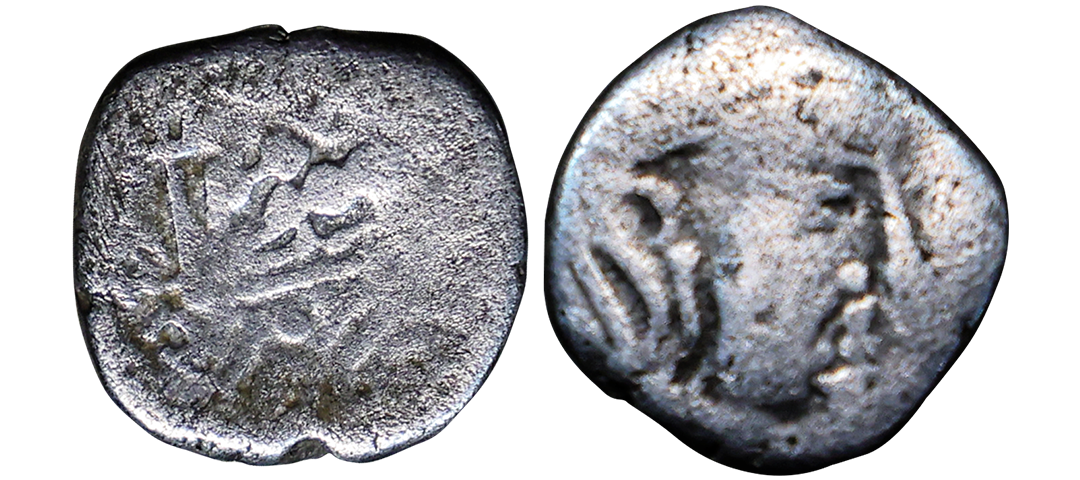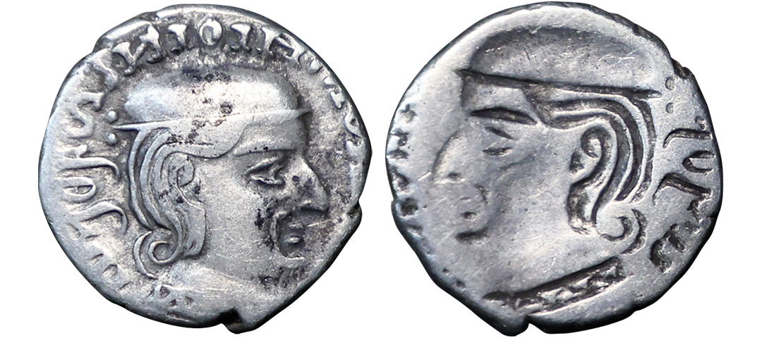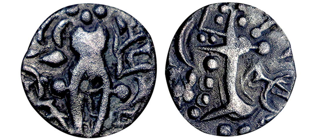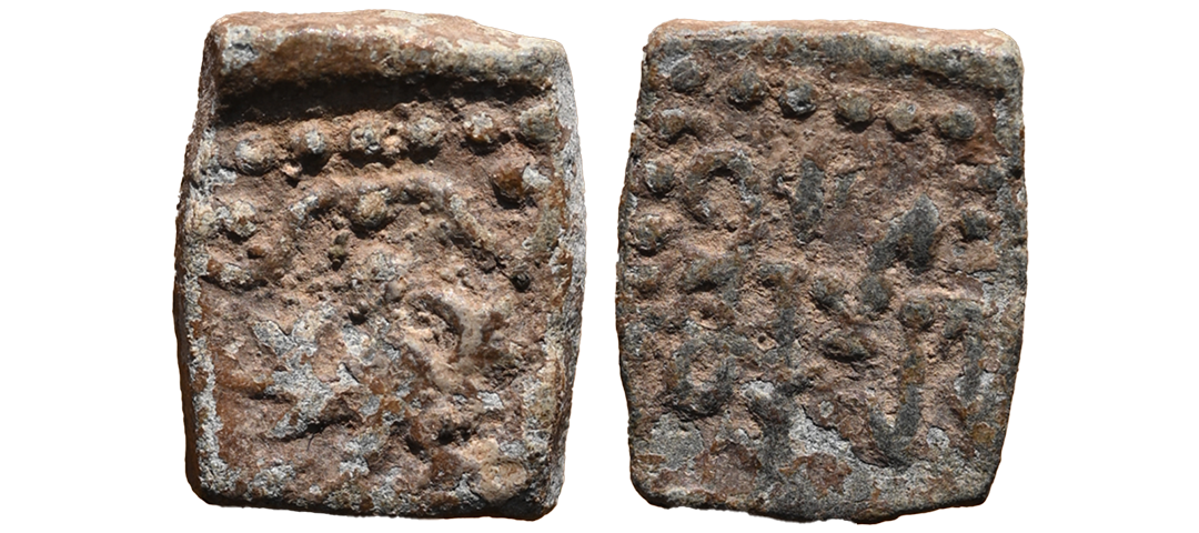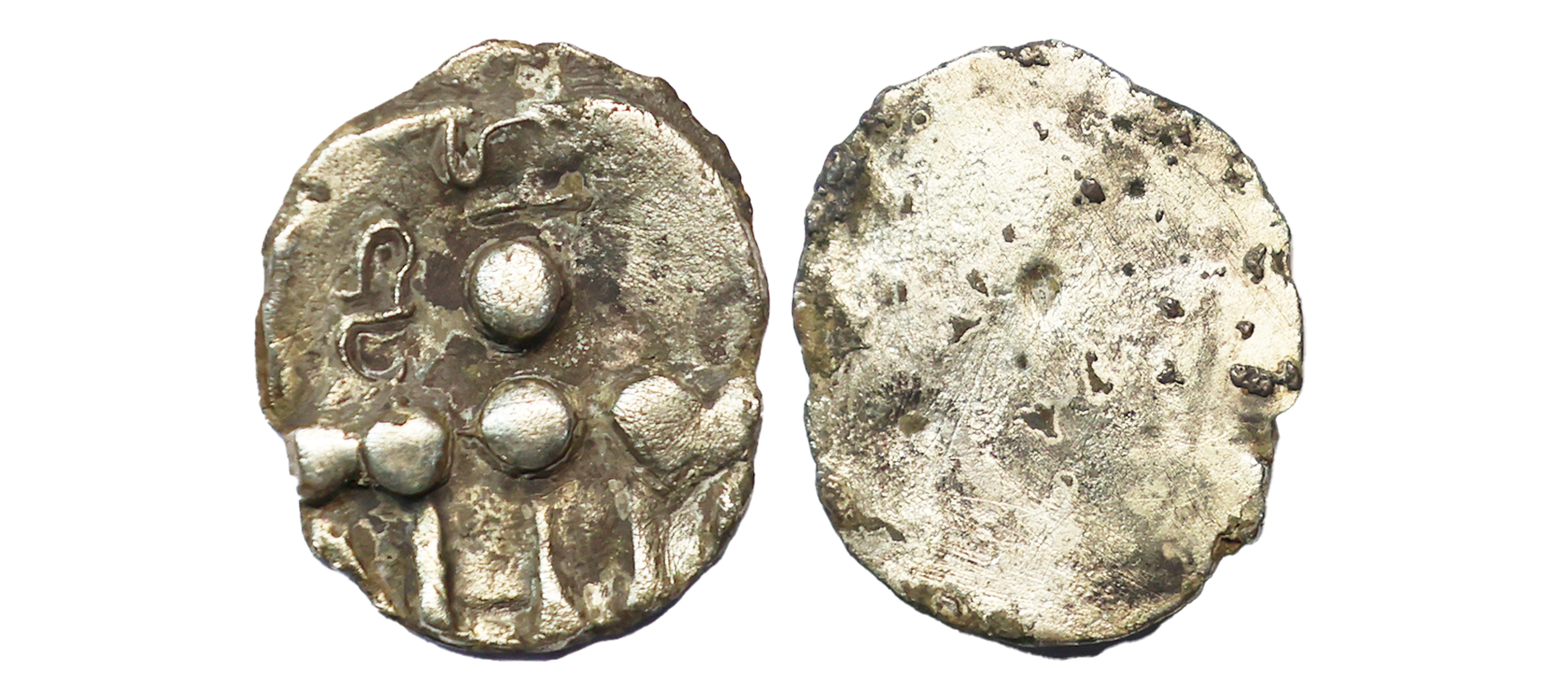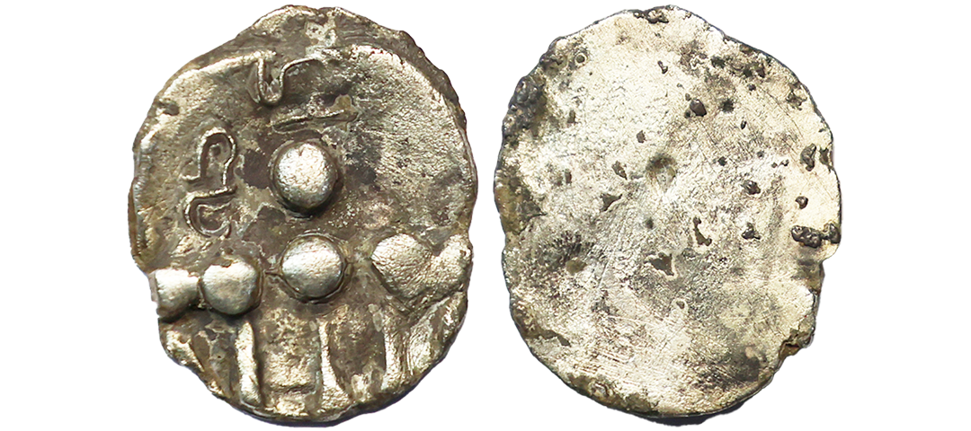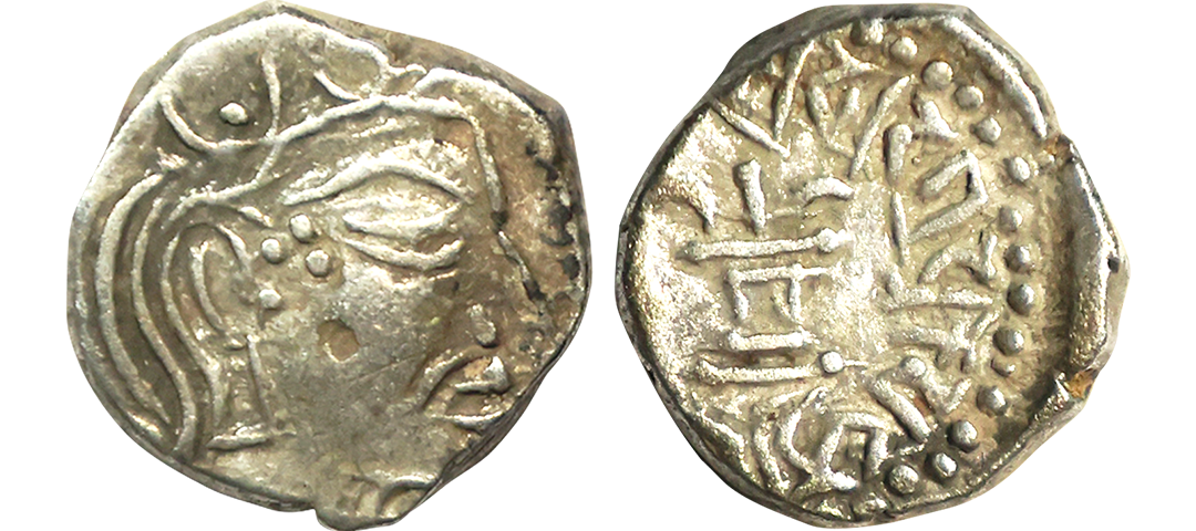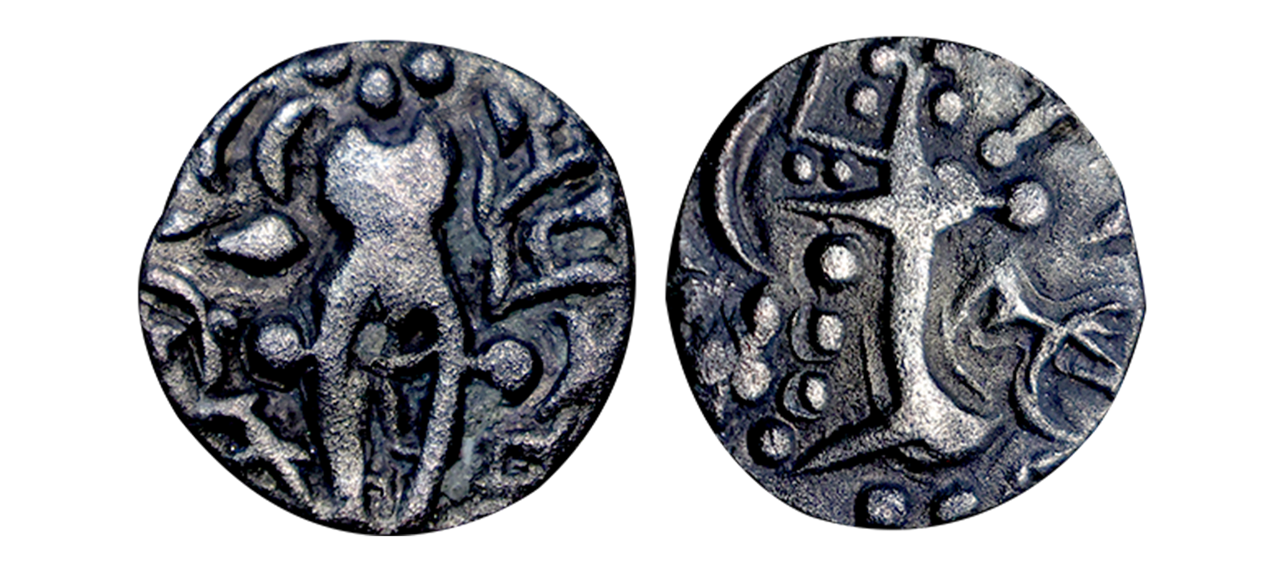 Hunnic Tribes, Western Turks, Shahi Tegin(Sri Shahi)( 680-700 AD), Copper Drachm, 2.63 gms, Uncertain Mint in Khorasan, Obv. Draped bust of Tegin to right, wearing winged crown surmounted by double crescent, ‘σριο τογινο βαyo’ ('His Perfection, Tegin, King' in Bactrian), Rev. Fire altar flanked by two winged attendants with headdresses leaning toward the altar and placing their hands on it Brahmi legends ‘Srima Deva Pattasri’(Sri made by God’s perfection) visible on the fire altar shaft, Gobl Type 206, choice extremely fine, very rare. Tegin was the King of Turk Shahis, a dynasty of Western Turk or mixed Western Turk-Hephthalite origin who ruled from Kabul and Kapisa to Gandhara in the 7th to 9th centuries. The reverses of the drachms of Tegin of Khorasan are perhaps the most elaborate and detailed in all of the Hunnic Western Turkish series. While the winged attendants flanking the fire altar are sometimes described as Kinnaras, mythical half-man and half-bird creatures. Note: Only 3-4 specimen sold globally with Boar countermark, being offered for the first time in any Indian Auction.