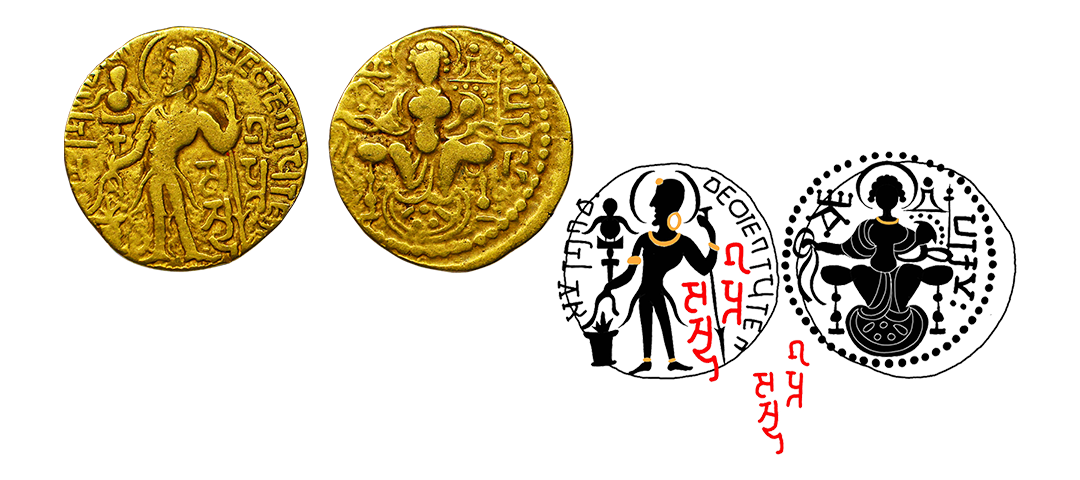 Gupta Empire, Samudragupta (335-375 AD), Gold Dinar, 7.45 gms, Complete Legend Samudraguptah below King's arm (very rare than usual), Scepter/Standard type, Obv. king standing facing left on grass, nimbate, holding the royal scepter in his left hand and sacrificing over an altar, Garuda standard in the left field, Brahmi legend ‘SaMuDra GuPtah’ below the king's arm, circular Brahmi legend ‘(Sama)RaSaTaViTaTaViJaYoJiTaRiPuRaJiTo(Divamjayati), Rev. nimbate goddess Lakshmi, seated on throne, a diadem and a cornucopia in her hands, a tamgha in the top-left field Brahmi legend "PaRaKraMah" in the right field, partial dotted border around, TOTGE Variety E, very fine, rare. Note: Above coin has full name 'SaMuDra GuPtah' legends below the kings arm on the obverse. Usual coin only bears legends 'Samudra', hence rare variety.