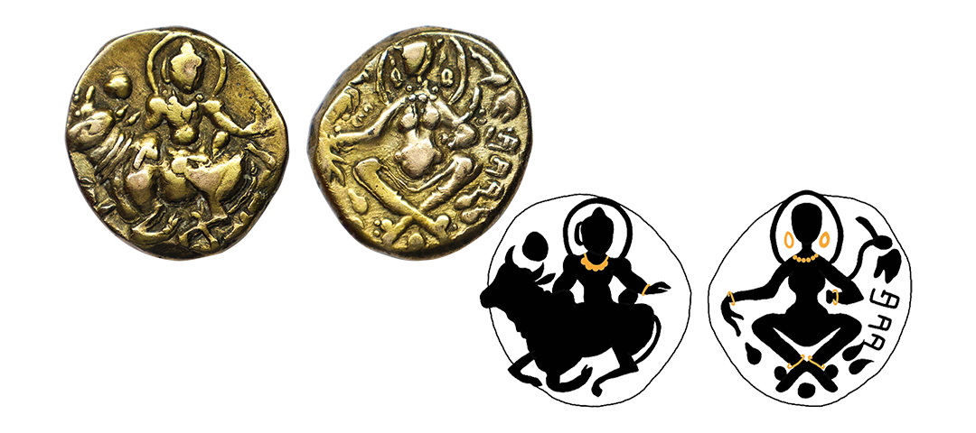 Post Gupta, Sasanka Dynasty, King of Gauda (600-630 CE), Base Gold Dinar, 8.88 gms, Abhishek Type, Obv. Nimbate Lord Shiva, seated facing on recumbent Bull facing towards left, with moon at upper left, Rev. Nimbate Goddess Lakshmi, seated cross-legged on a lotus, holding a lotus in left hand, two elephants are pouring water over her head, Brahmi legend "Sri ShaShaNka" in the right field, Bose Nasir #SGA-10.1, choice very fine, very rare.