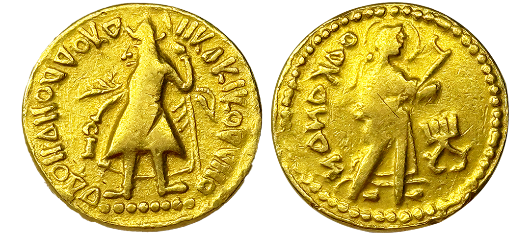 Gupta Empire, Chandragupta II (375-415 AD), Gold Dinar, 7.59 gms, Lion-Slayer Type, Obv. king standing, is seen mid-hunt, wearing dhoti and sash on his upper torso, holding a bow in his left hand with the right releasing the bowstring, the lion is facing the king and seen falling backward probably with an arrow in its mouth, the Brahmi legend around the field, Rev. goddess Lakshmi seated on a Lion to left, showering coins with her right hand and a lotus in her left hand, ‘Simhavikramah’ on the right field, TOTGE Class III-Var. A.4.2, very fine, very rare.