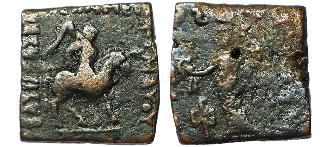 Indo Scythian, Maues (125-85 BC), Copper Unit, 9.85 gms, Obv. Horserider to right holding whip Greek legends ‘ΒΑΣΙΛΕΩΣ ΒΑ/ΣΙΛΕΩΝ ΜΕ/ΓΑΛΟΥ ΜΑΥΟΥ’ around, Rev. Nike standing to left, monogram on left field, Senior #16.1, fine, very scarce