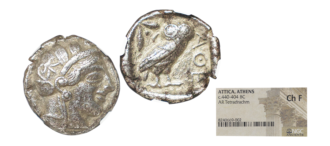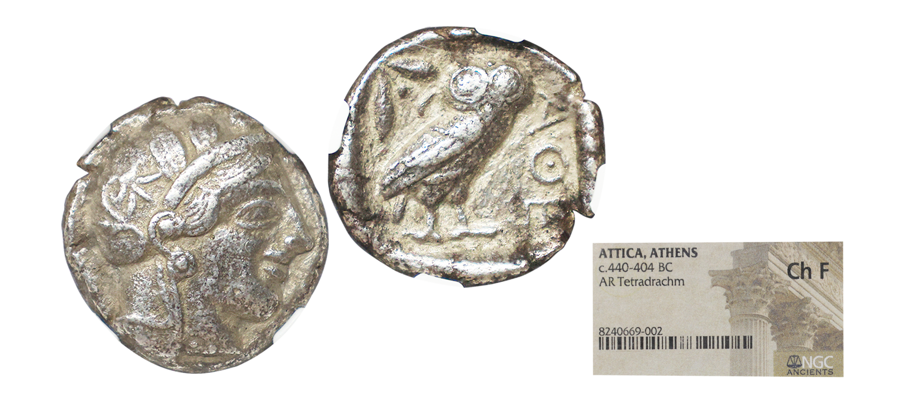 Athens (5th Century BC), Silver Tetradrachm, Owl, Obverse: Helmeted bust of Goddess Athena to right, Horse hair crest above helmet, Reverse: Standing figure of Owl, an olive twig at left, Letters ‘AOE’ in right field standing for ‘the Athenians’, These coins are one of the first to depict a bust, The bust is of Athena, daughter of Zeus, Athena represented wisdom and warfare, The Owl was a symbol of Athenian polis (Greek State), It was also the mascot of Athena, again symbolizing wisdom, Given its wide circulation in the ancient world, this coin is also considered to be the first international trade coin, nice, Graded by NGC Ancients Choice Fine, very rare.