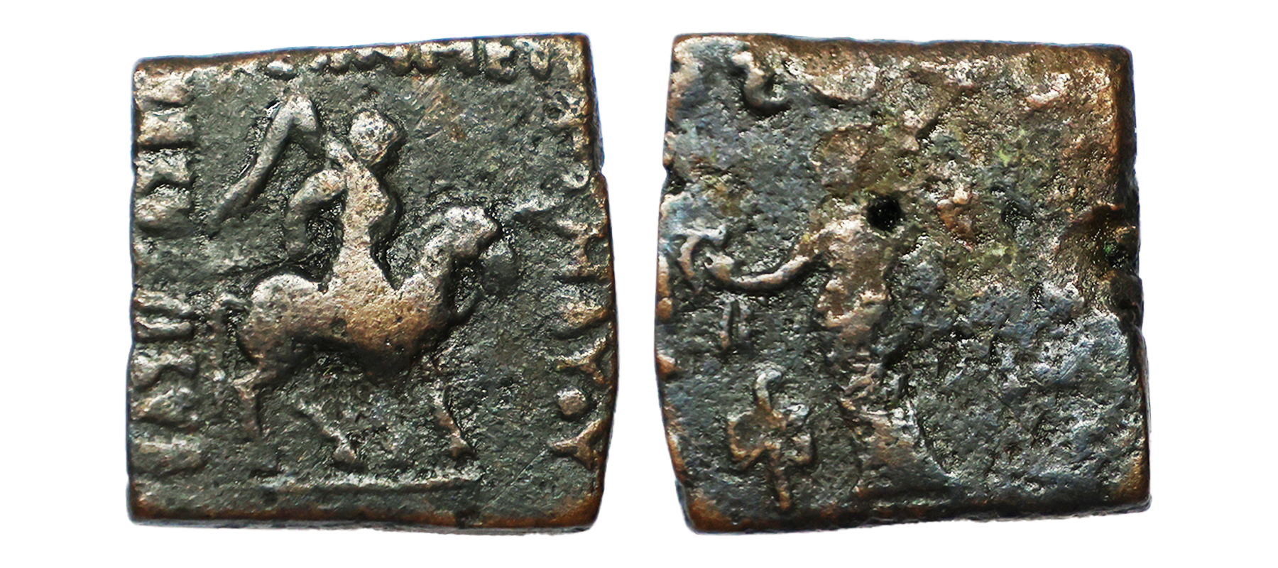 Indo Scythian, Maues (125-85 BC), Copper Unit, 9.85 gms, Obv. Horserider to right holding whip Greek legends ‘ΒΑΣΙΛΕΩΣ ΒΑ/ΣΙΛΕΩΝ ΜΕ/ΓΑΛΟΥ ΜΑΥΟΥ’ around, Rev. Nike standing to left, monogram on left field, Senior #16.1, fine, very scarce