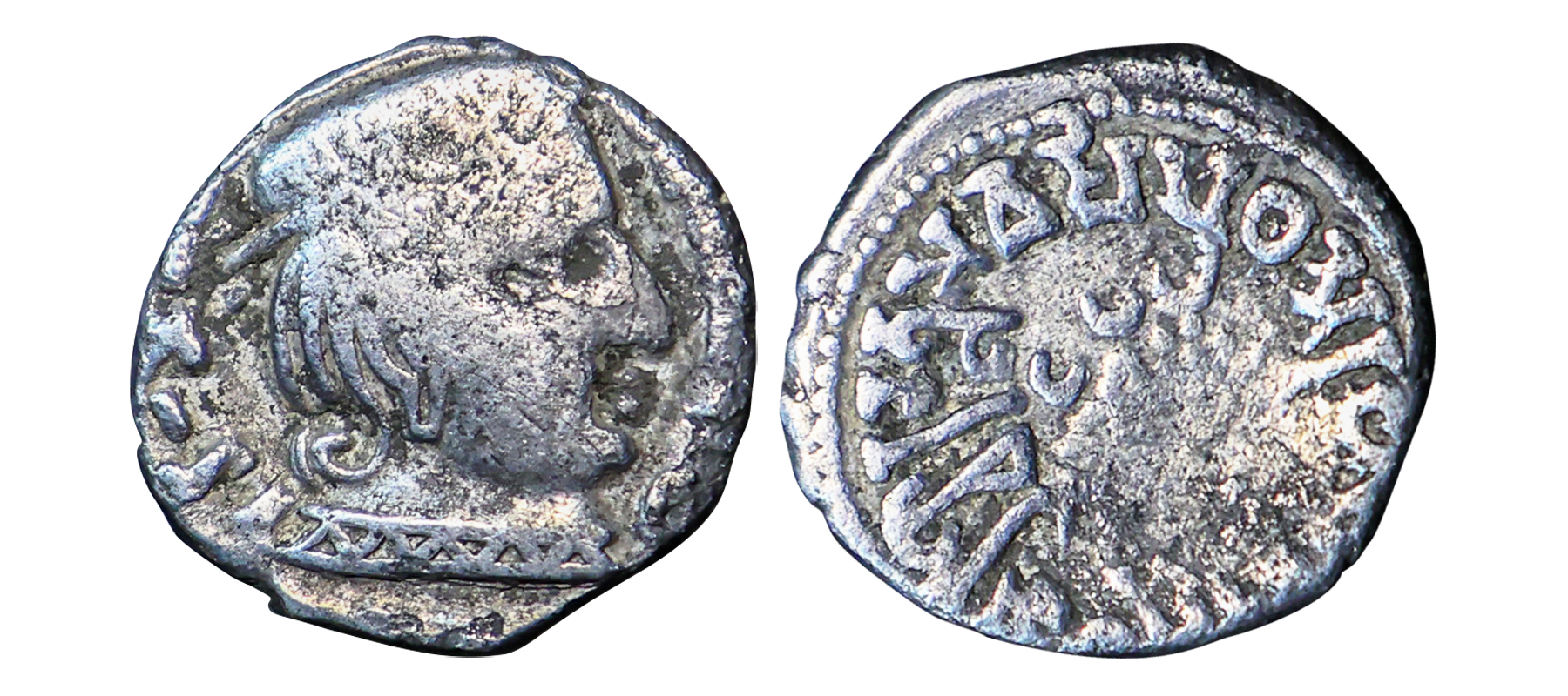 Indo Scythian, Maues (125-85 BC), Copper Unit, 9.85 gms, Obv. Horserider to right holding whip Greek legends ‘ΒΑΣΙΛΕΩΣ ΒΑ/ΣΙΛΕΩΝ ΜΕ/ΓΑΛΟΥ ΜΑΥΟΥ’ around, Rev. Nike standing to left, monogram on left field, Senior #16.1, fine, very scarce