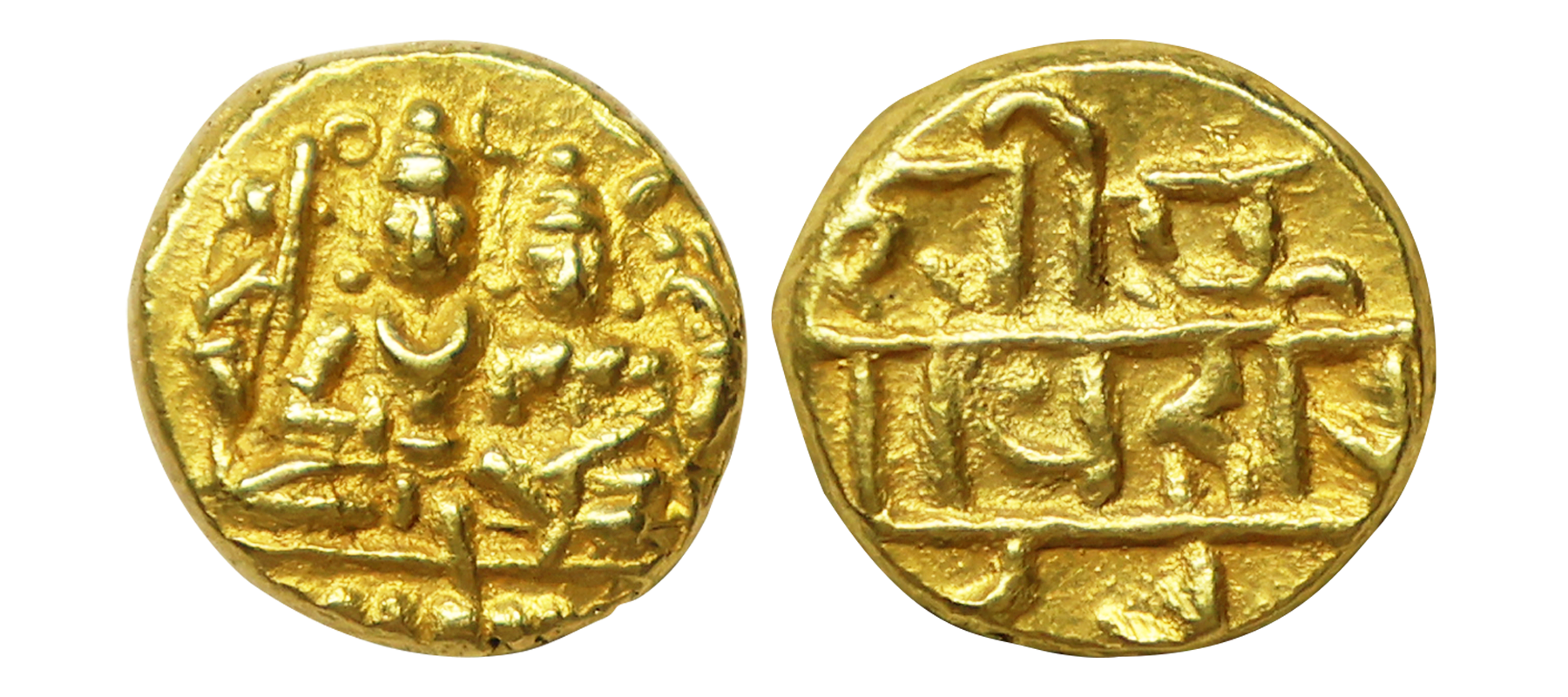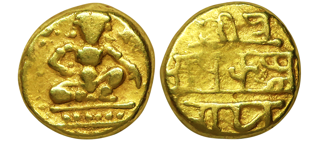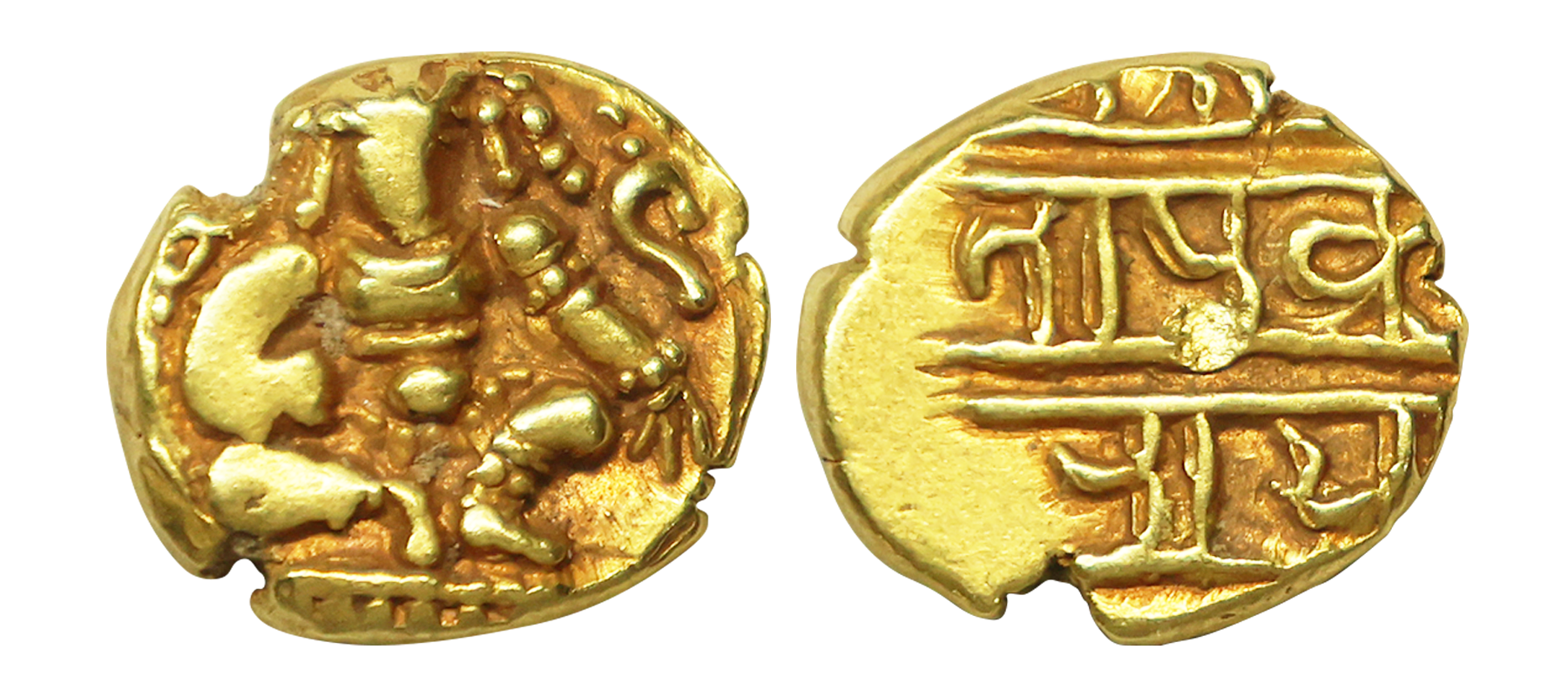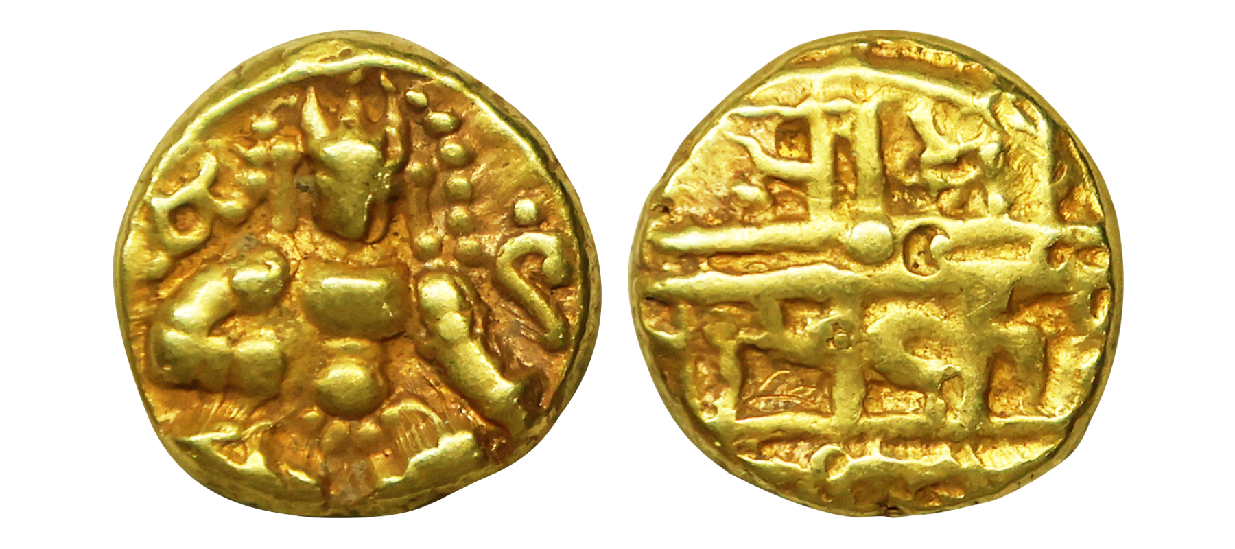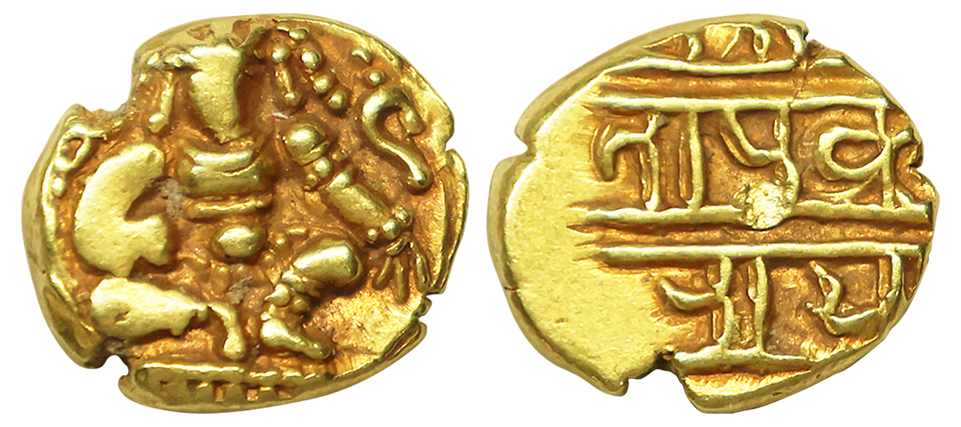 Dehli Sultanate, Ghorid Dynasty, Mu'izz ud-din Muhammad bin Sam, (AH 589-602, 1193-1206 AD), Gold Unit, 4.34 gms, Kanuaj Type, Obv. Seated goddess Lakshmi, Rev. Sri maha / mada bini/ sam, G&G # D5, Deyell #252, about extremely fine, very rare.