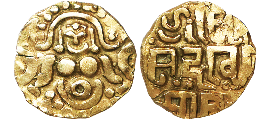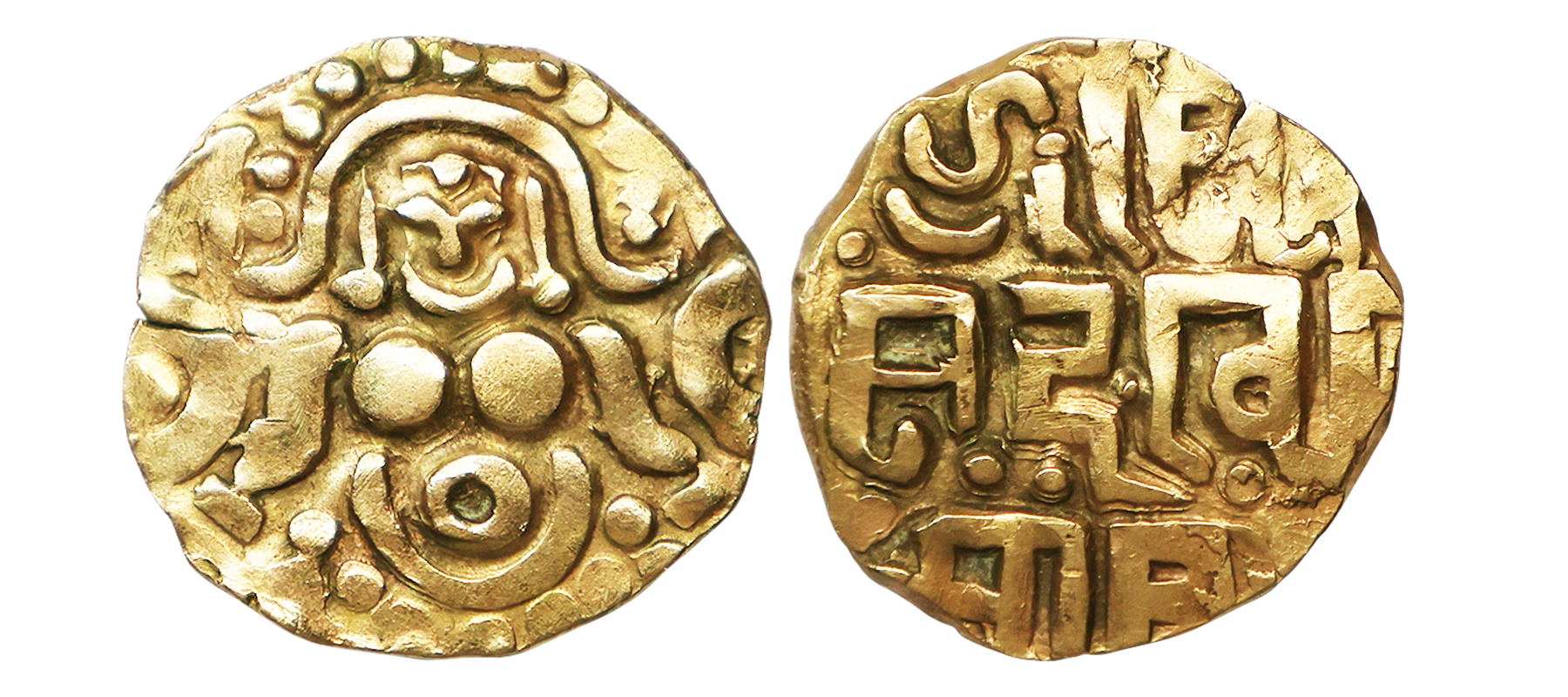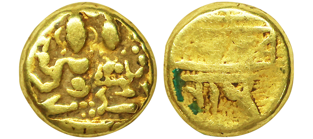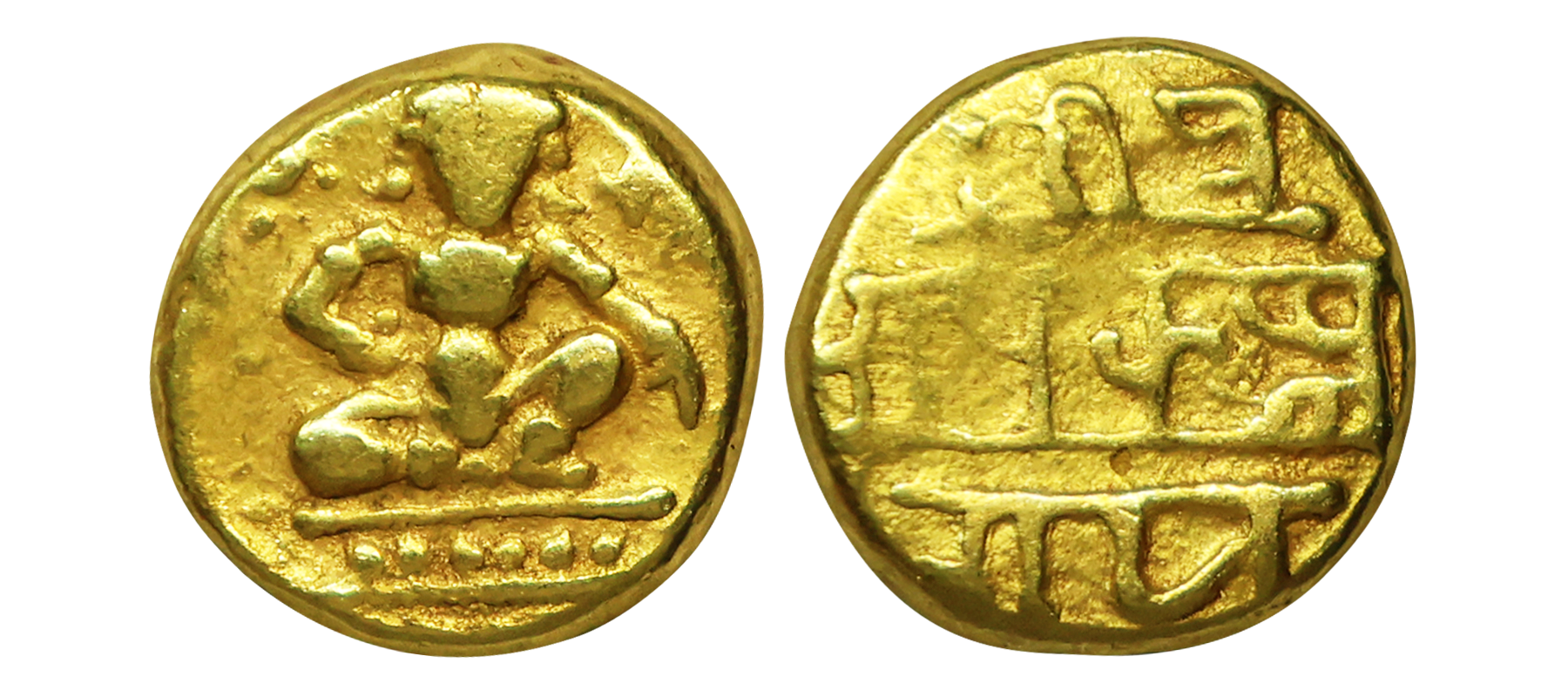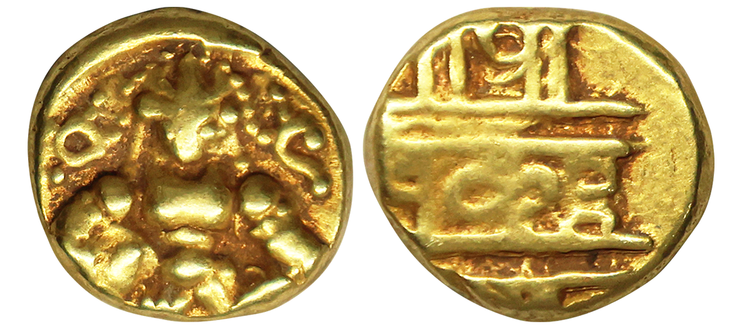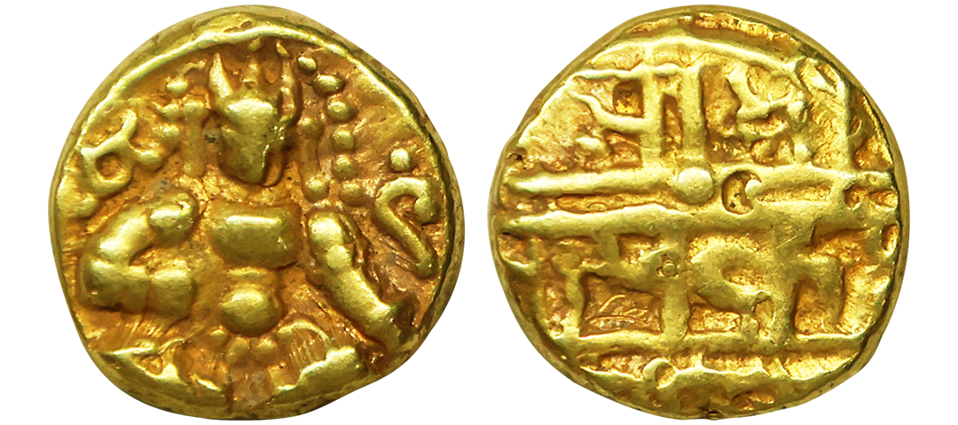 Dehli Sultanate, Ghorid Dynasty, Mu'izz ud-din Muhammad bin Sam, (AH 589-602, 1193-1206 AD), Gold Unit, 4.34 gms, Kanuaj Type, Obv. Seated goddess Lakshmi, Rev. Sri maha / mada bini/ sam, G&G # D5, Deyell #252, about extremely fine, very rare.