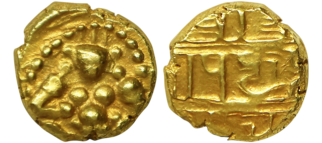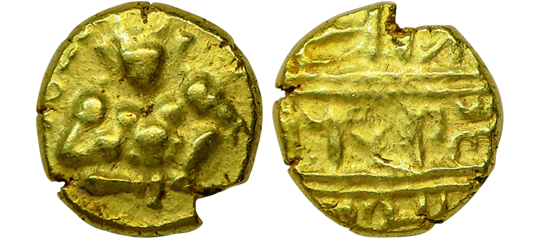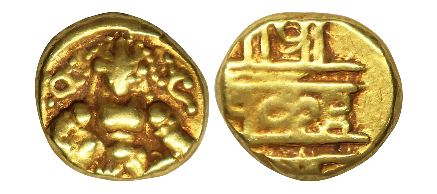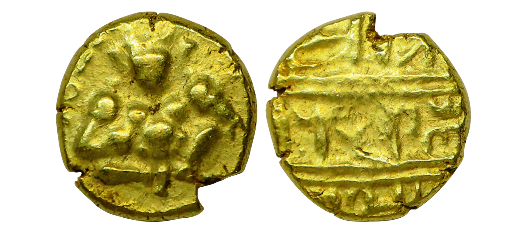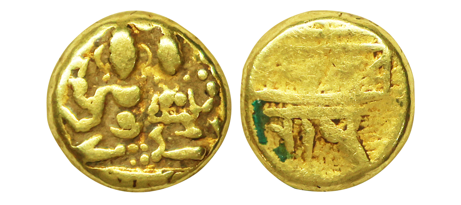 Dehli Sultanate, Ghorid Dynasty, Mu'izz ud-din Muhammad bin Sam, (AH 589-602, 1193-1206 AD), Gold Unit, 4.34 gms, Kanuaj Type, Obv. Seated goddess Lakshmi, Rev. Sri maha / mada bini/ sam, G&G # D5, Deyell #252, about extremely fine, very rare.