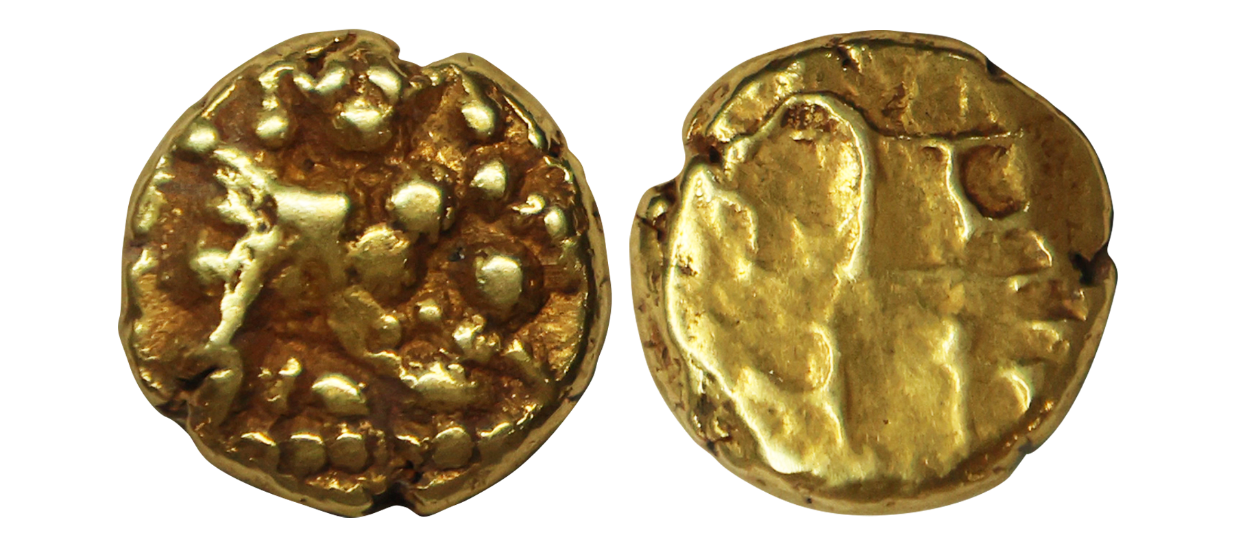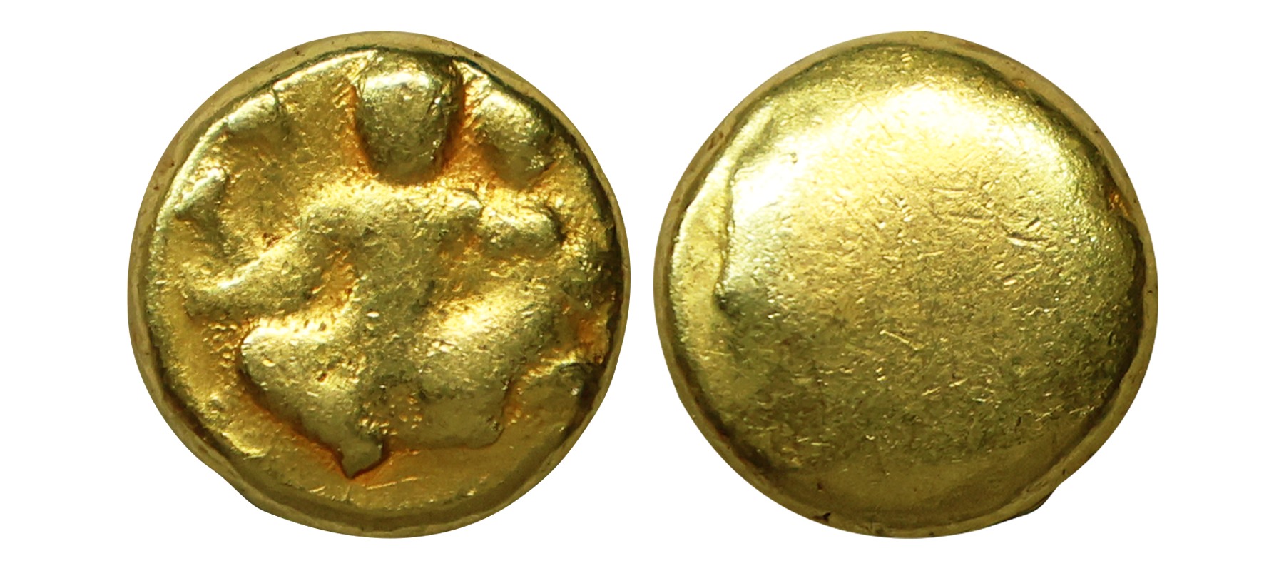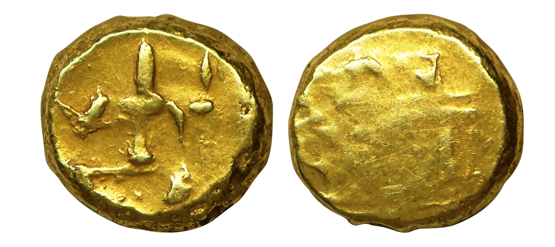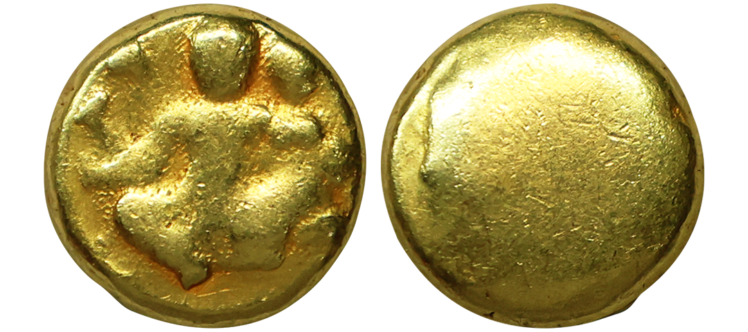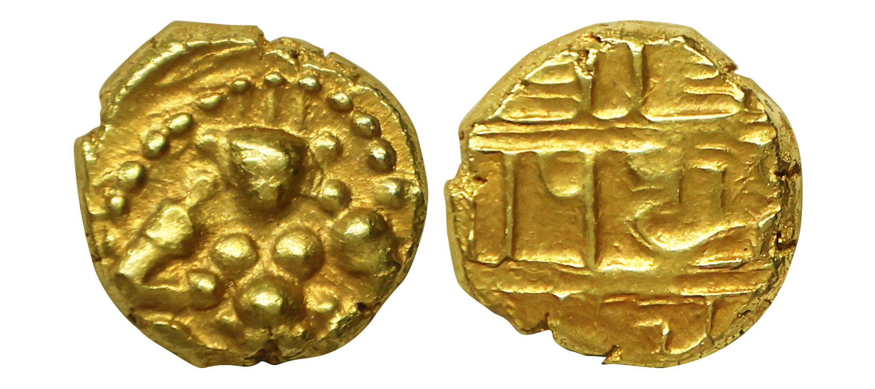Dehli Sultanate, Ghorid Dynasty, Mu'izz ud-din Muhammad bin Sam, (AH 589-602, 1193-1206 AD), Gold Unit, 4.34 gms, Kanuaj Type, Obv. Seated goddess Lakshmi, Rev. Sri maha / mada bini/ sam, G&G # D5, Deyell #252, about extremely fine, very rare.