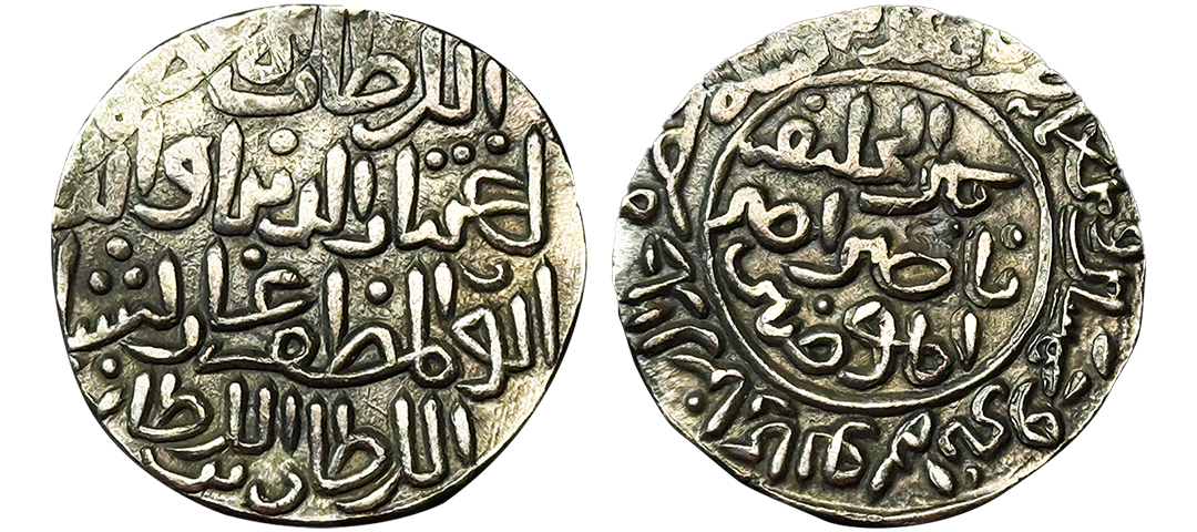 Sultans of Bengal, Silver tanka of Ikhtiyar al-Din Ghazi (in East Bengal) (1349-1352 AD), Hadrat Jalal Sunargaon mint, AH 751, G&G B138 (Listed as RR), 10.97g. Obv: Arabic legend al-sultan al-a'zam ikhtiyar al-dunya wa'l din abu'l muzaffar ghazi shah al-sultan bin al sultan. Rev: In circle, Arabic legend yamin al-khalifa nasir amir al-mu'minin with date and mint-name around. About extremely fine, Very rare.