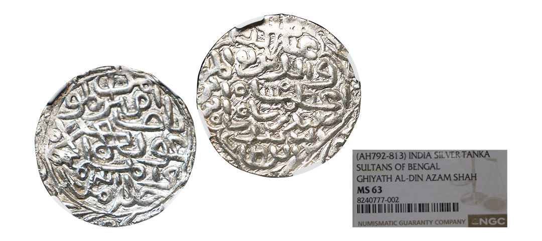 Sultans of Bengal, Silver tanka of Ikhtiyar al-Din Ghazi (in East Bengal) (1349-1352 AD), Hadrat Jalal Sunargaon mint, AH 751, G&G B138 (Listed as RR), 10.97g. Obv: Arabic legend al-sultan al-a'zam ikhtiyar al-dunya wa'l din abu'l muzaffar ghazi shah al-sultan bin al sultan. Rev: In circle, Arabic legend yamin al-khalifa nasir amir al-mu'minin with date and mint-name around. About extremely fine, Very rare.