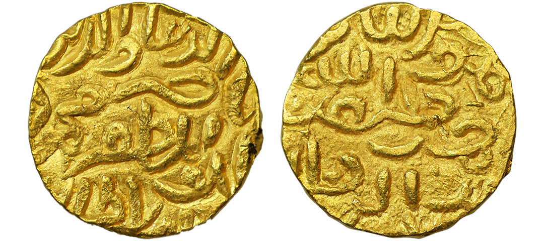 Madura Sultanate, Jalal al-din Ahsan Shah (AH 734-740; 1333-1339 AD), Gold Tanka, 11.02g, Hadrat Madhura Mint, AH 735, abul za'afa'a wa'l masakin Ahsan Shah al-sultan khuldat khilafatahu legend on obv. Uncirculated. All gold coins of Madura Sultan are extremely rare. Coins of Ahsan Shah are not listed in Goenka and Goron nor in Rajgor’s catalogues.