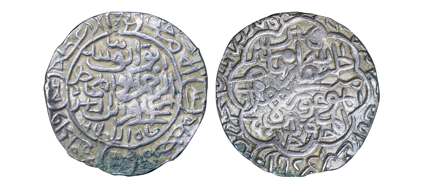 Sultans of Bengal, Silver tanka of Ikhtiyar al-Din Ghazi (in East Bengal) (1349-1352 AD), Hadrat Jalal Sunargaon mint, AH 751, G&G B138 (Listed as RR), 10.97g. Obv: Arabic legend al-sultan al-a'zam ikhtiyar al-dunya wa'l din abu'l muzaffar ghazi shah al-sultan bin al sultan. Rev: In circle, Arabic legend yamin al-khalifa nasir amir al-mu'minin with date and mint-name around. About extremely fine, Very rare.