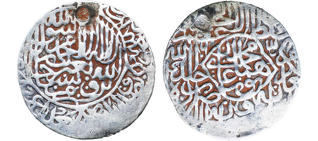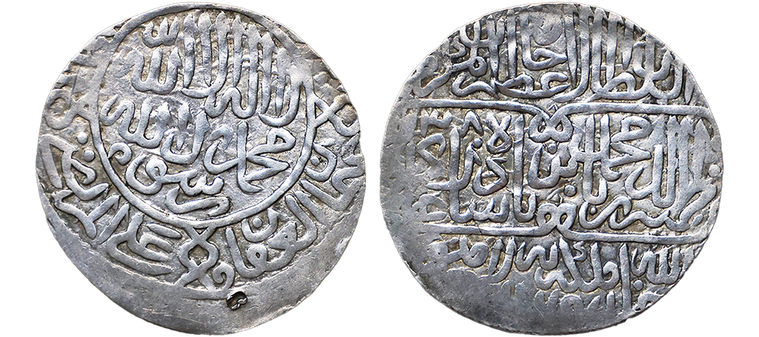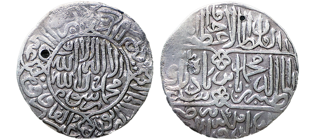 Humayun (In exile, 1540-1555 AD), Qandahar Mint, Silver Shahrukhi (Misqal/Mithqal), Jointly issued with the name of Tahmasp I Safavid of Iran, Obv: Arabic legend Shi'it version of the Kalima (La Ilaha Illallah) Muhammad Rasulullah Ali Wali Allah, with the name & titles of Tahmasp "al-sultan-ul-azam wa'l Khaqan (al-mukarram Shah Tahmasap Al-Husaini)" partly visible, Rev: Arabic legend Shi'it version of Kalima Shahada (La Ilaha Illallah) Muhammad Rasulullah 'Ali Wali Allah, with the full name of "(Muhammad Humayun Ghazi bin) Zahir-ud-din Muhammad (Babur) Badshah Ghazi, Zarb Qandahar" partly visible, 4.80g, (Ref. JONS # no 114), some usual area of flatness, about very fine, Exceedingly Rare. Similar Coin Sold in Marudhar Arts Auction No. 45 for 5.60,000. Below Note by Marudhar arts. Note: Humayun, after being Defeated by Sher Shah Suri, sought refuge at the Persian Shah's court in 950 AH (1543 AD). During his two-year exile, he sought Shah Tahmasp's support to reclaim his throne in India. In exchange for assistance, Humayun agreed to convert to the Shia sect of Islam and promised to cede Qandahar upon its conquest. Upon the successful capture of Qandahar, tensions arose with the Persian garrison, leading Humayun to personally lead the expulsion of the Persians. Despite potential friction with Shah Tahmasp, Humayun appointed Behram Khan, a Shia general and future mentor to Akbar, as Governor of Qandahar. Diplomatic ambassadors were dispatched to reassure Shah Tahmasp of Behram Khan's loyalty, after dismissing the Shah's envoy, Bidagh Khan, for disobedience. To strengthen the alliance, Humayun minted coins in Shah Tahmasp's name with Shia inscriptions. These coins, likely minted shortly after Qandahar's recapture in 1545 AD, were timed to coincide with the arrival of Humayun's envoys and letters to the Shah's court, anticipating the Shah's positive response. The issuance of these coins served as a strategic diplomatic move by Humayun to secure Persian support in his quest to reclaim his Indian territories.