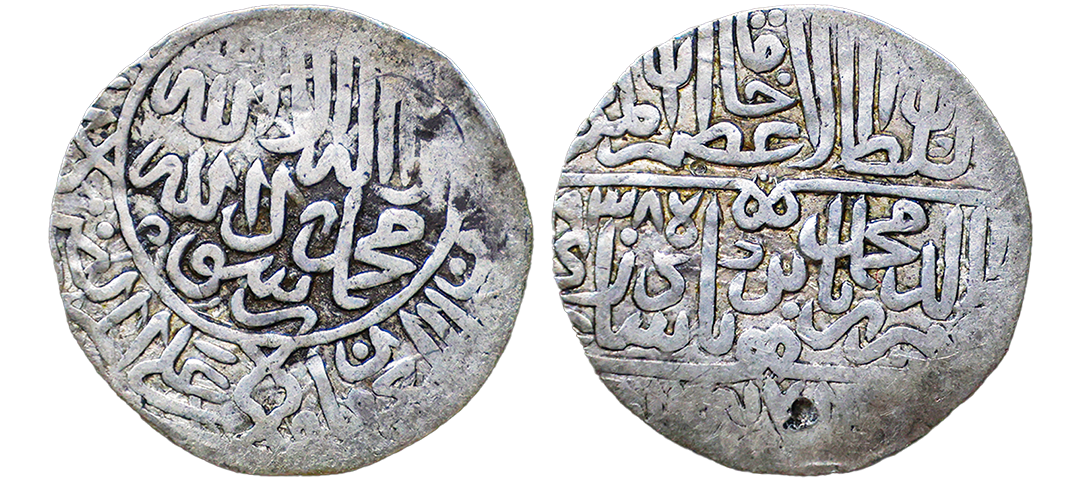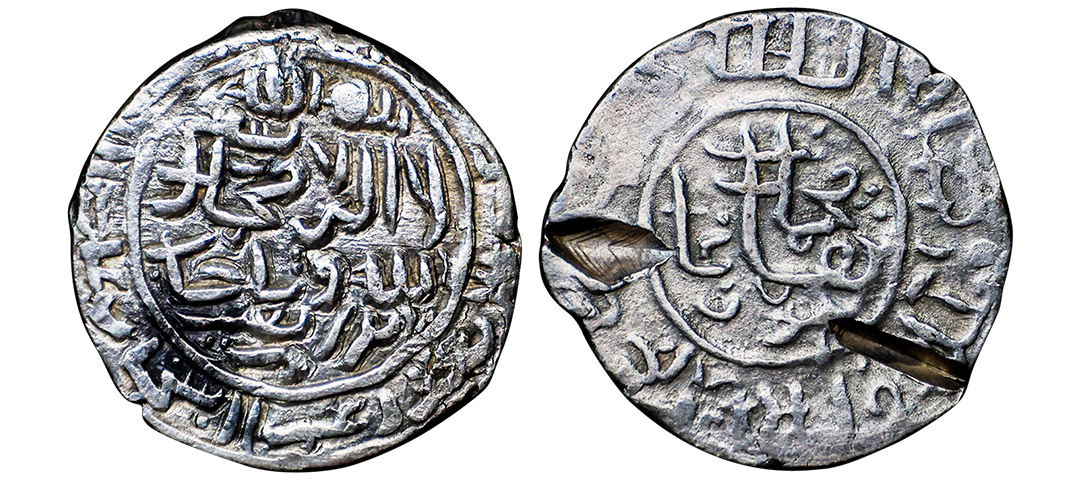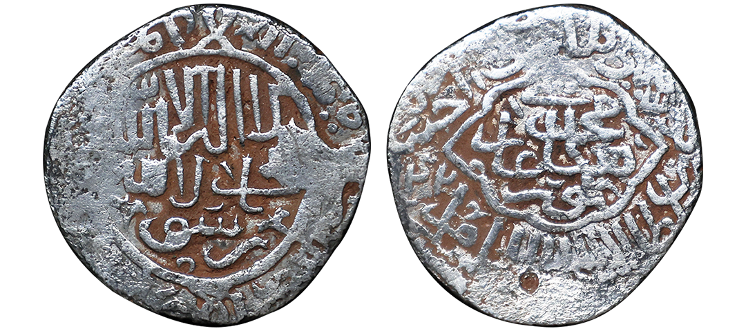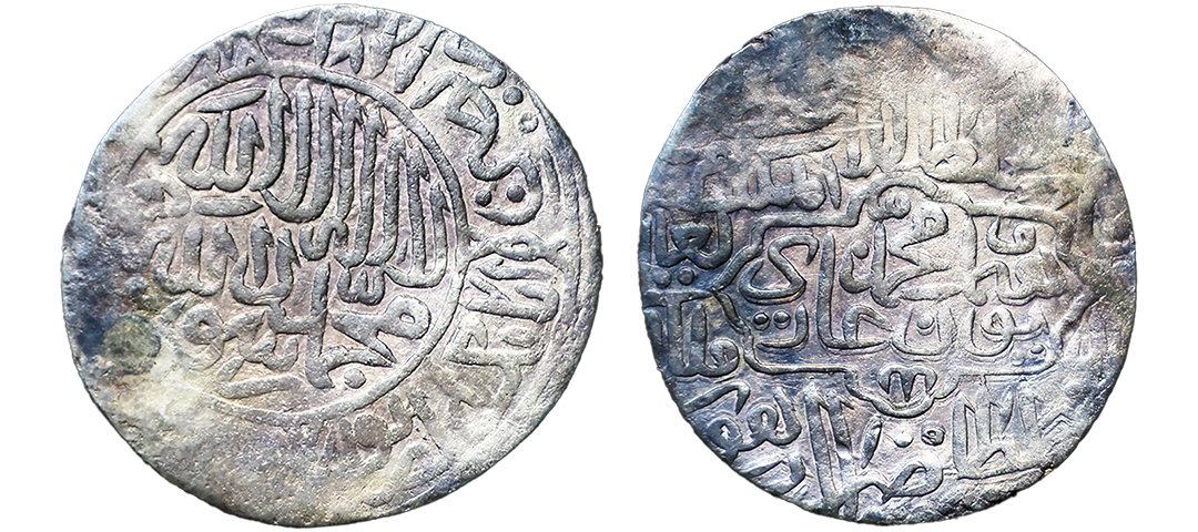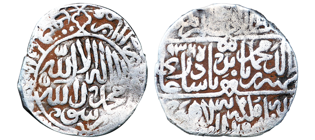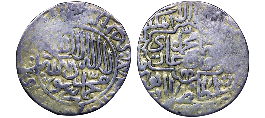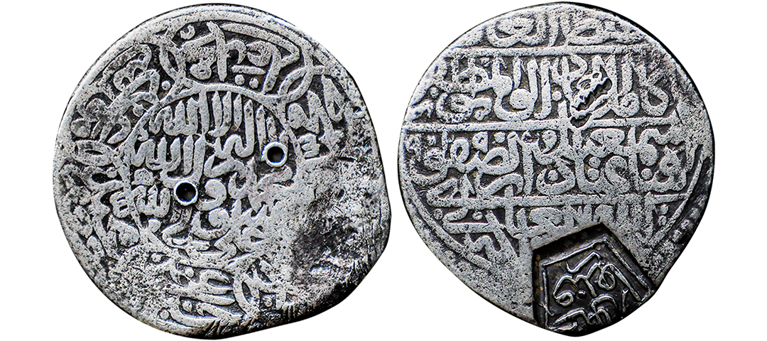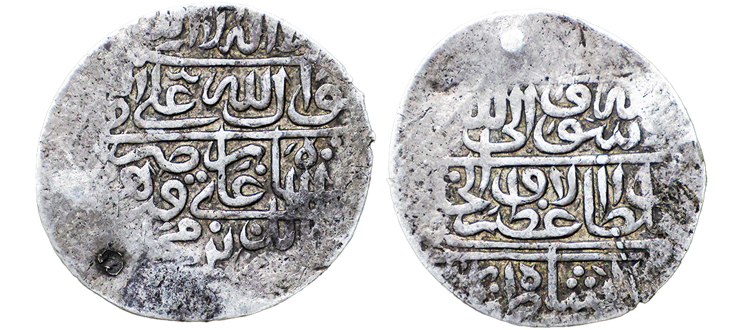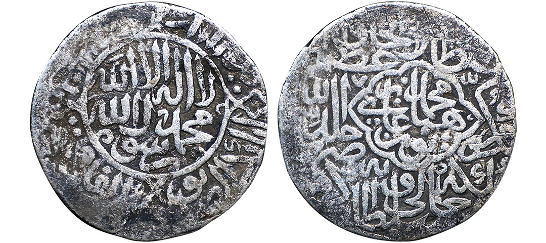 Humayun (АН 945/1538-1539 AD), Mintless, Fathabad Type, Silver Tanka, Obv: The Kalima Shahada with Allah yarzuq main yasha'u ba-ghair hisab within a circle & around four Caliphs' names, Rev: Muhammad Humayun Ghazi within a circle, with titles around, 10.5g, (G&G # B956), about extremely fine, usual chop marks, Very Rare. Goron assigned this piece by its style to the Bengali mint of Fathabad.