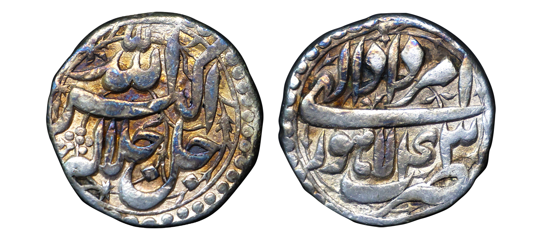Akbar (AH 963-1014, 1556-1605 AD), Silver ½ Rupee, 5.72 gms, Surat (سورت) Mint, AH 984, Obv. Kalima Shahada withing dotted square & mint name Surat in left quadrant, Rev. Jalal-ud-din Muhammad Akbar Badhsh Ghazi with date AH984 withing dotted square, Mint State specimen with pleasing luster, Almost complete mint name on flan, Unreported, Unique, exceedingly rare. As a chaotic succession crisis unfolded for the Gujarat Sultanate, Akbar recognized that the matter of conquering Gujarat was of paramount importance. He subsequently launched his campaign from Fatehpur Sikri on the day 20 Tir, divine month, corresponding to Tuesday, 20 Safar 4th July 1572. Upon conquering Ahmedabad, Akbar received information that the Mirza rebels were in Surat. He then marched to annex the fort, arriving in its vicinity on 8 Bahman, Divine month corresponding to Monday, 7th Ramazan, 11th January 1573(AH 980), & following roughly six weeks of resistance, the fort's commandant surrendered on 26 February 1573. Akbar Surat Mint Rupees are known with dates, AH 1002 & some are known with RY 37, 38 which corresponds to AH 1001 & AH 1002. This particular coin, dated AH 984, has the earliest reported date for a silver coin from the Surat mint. One copper ½ Falus of Gujarat Standard from Surat Mint was reported with a partial date ‘AH 98x’. (JONS Vol. 237, Autumn 2019) It is also interesting that the name of the Surat mint is inscribed as 'Zurat' on later rupees, i.e. ‘ص’ instead of ‘س’. The coin bears the complete mint name 'سورت', which is insribed with a 'س'. This makes the coin a new, unreported, and unique discovery.