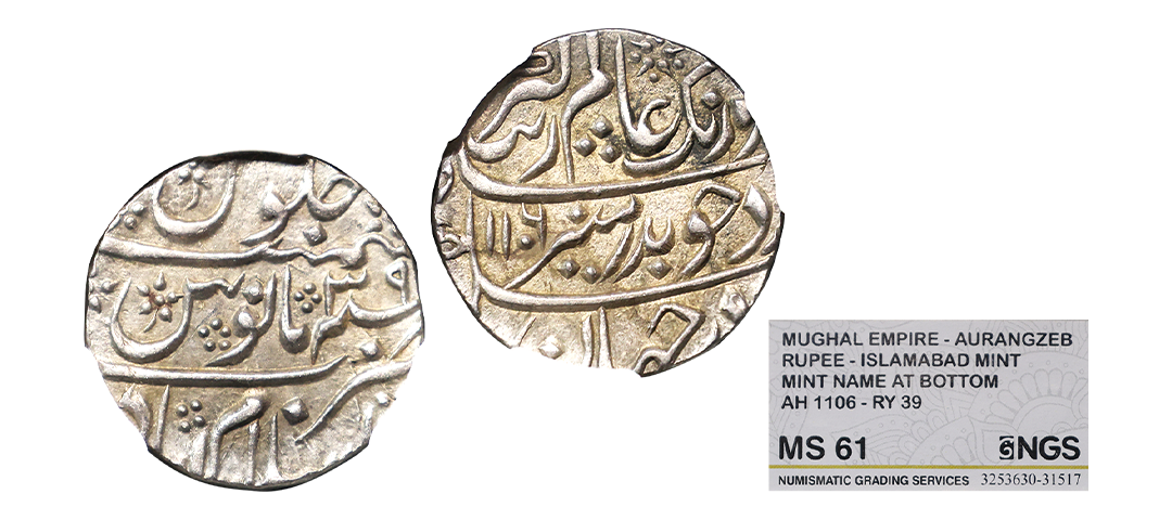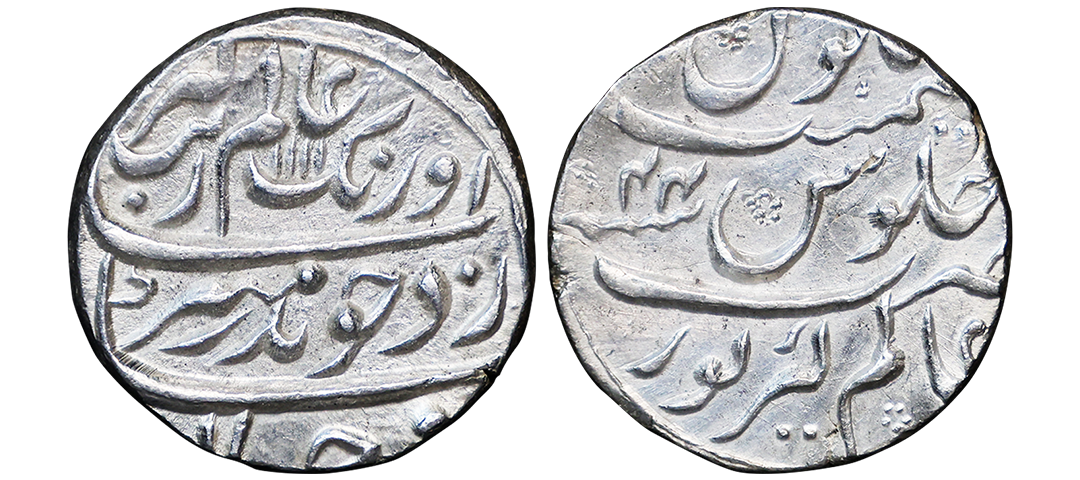 Aurangzeb (AH 1068 1118, 1658-1707 AD), Gold Mohur, Zafrabad Mint, RY 13, Mehr-e-Munir Couplet, Obv. Sikka dar Jahan zad chu Mehr-e-munir Aurangzeb Alamgir, Rev. manus maimanat sana julus zarb Zafarabad, KM #315.49, Choice Brilliant Uncirculated, Very high Relief with a sharp strike & pleasing mint-lustre throughout the field, beautiful motifs, very rare in this quality.