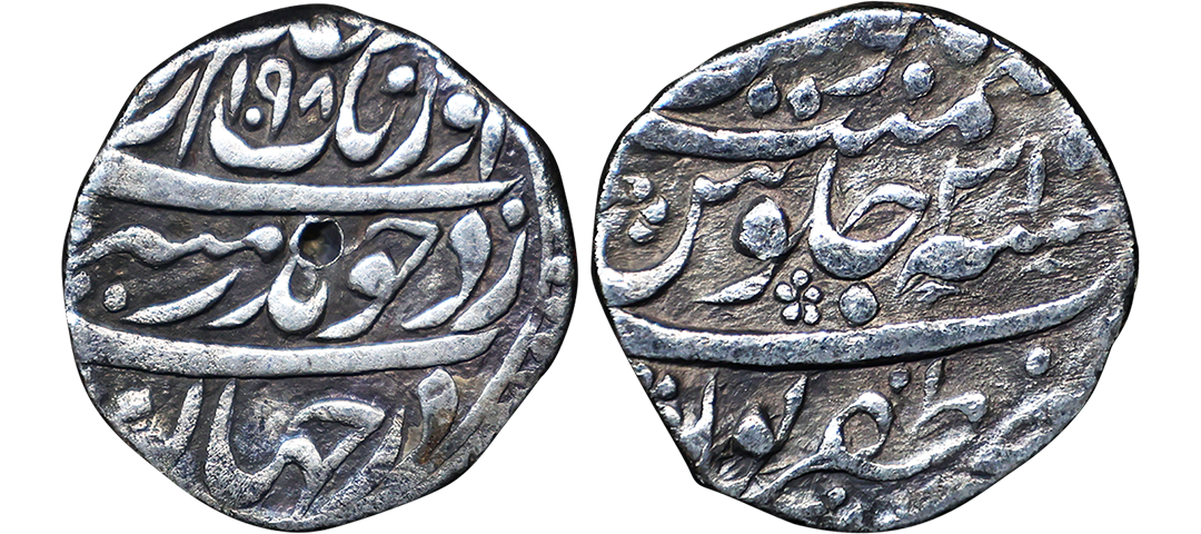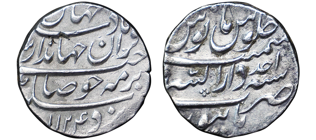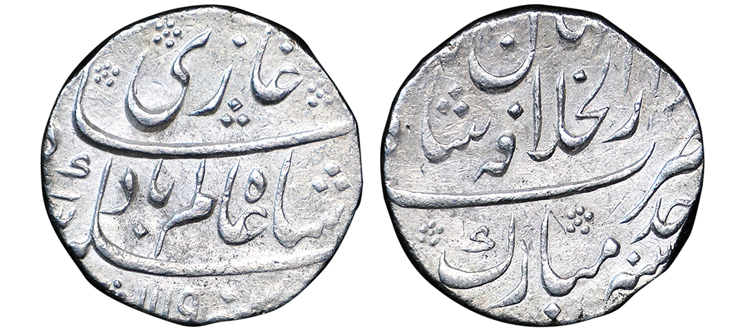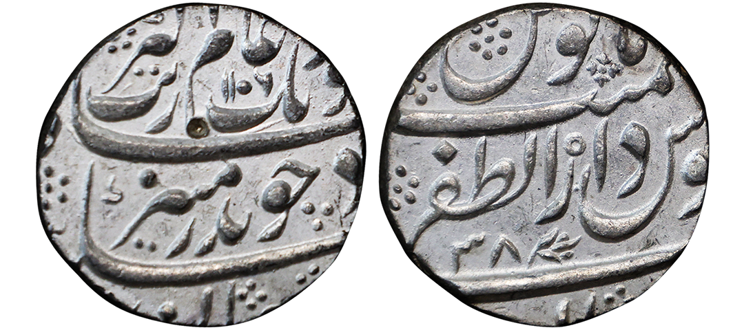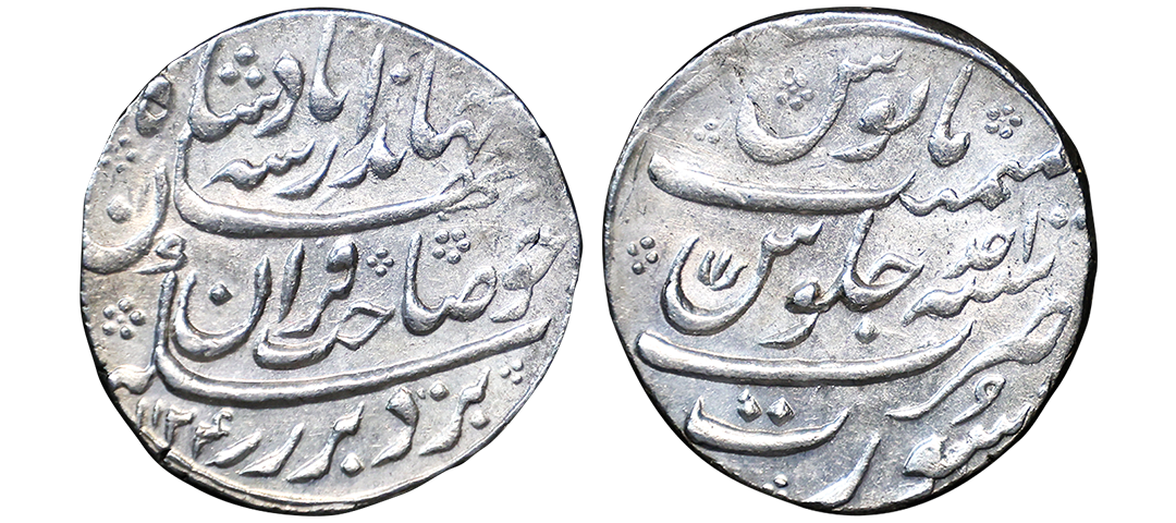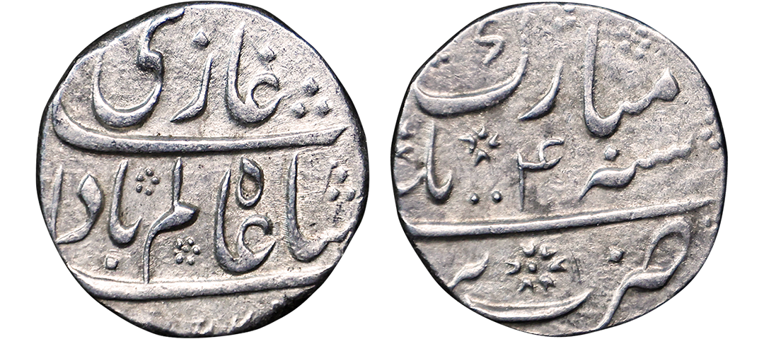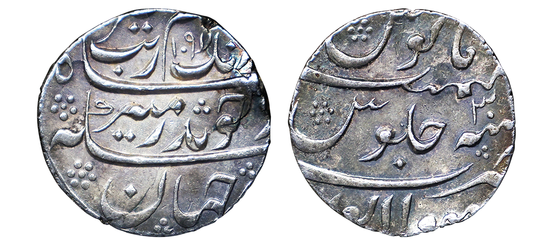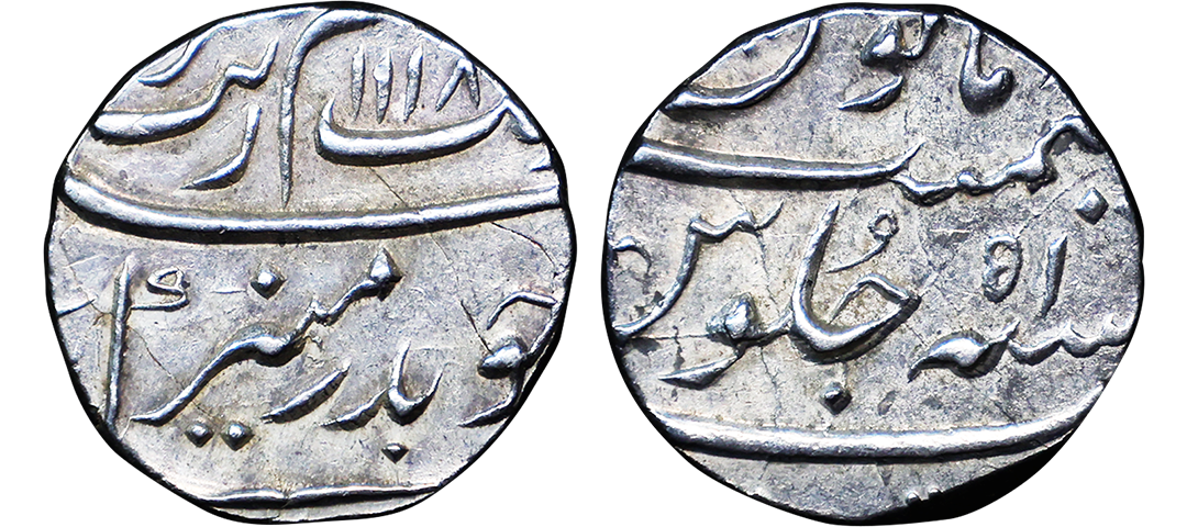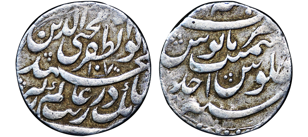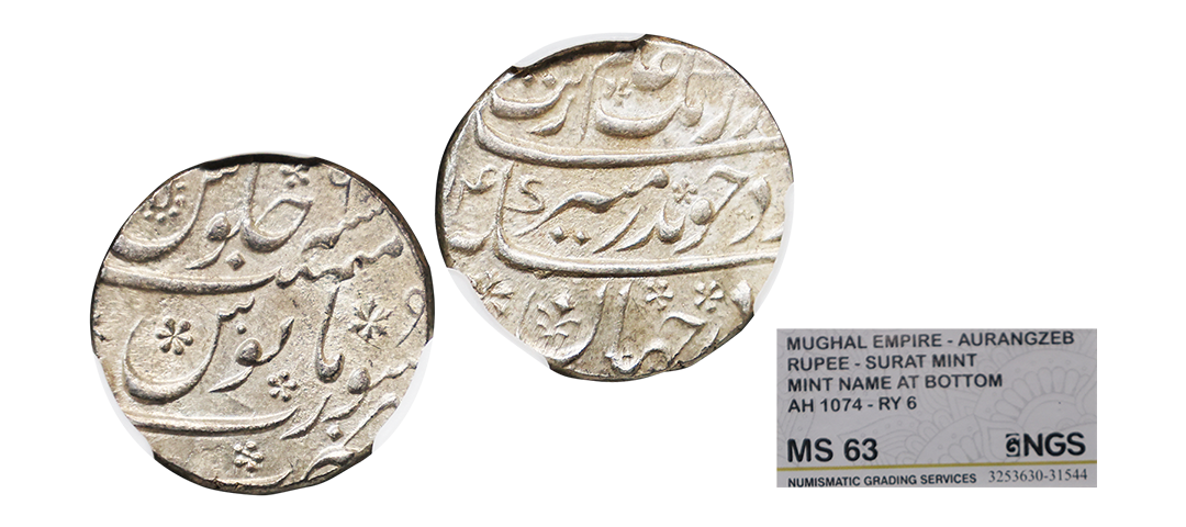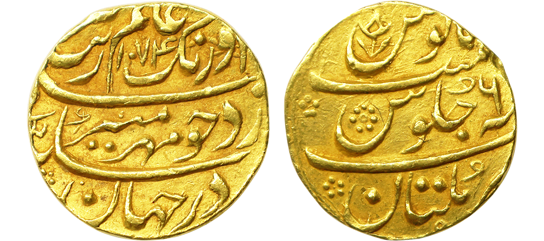 Aurangzeb (AH 1068-1118, 1658-1707 AD), Gold Mohur, 10.92 gms, Multan Mint AH 1074, RY 6, ‘Mihr Munir Couplet, Obv. sikka zad-dar jahan zad chu mihr-e-munir, Shah Aurangzeb Alamgir and Hijri year 1074, Rev. manus maimanat sana julus zarb Multan, KM #315.36, extremely fine, very rare.