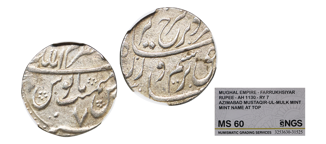 Rafi-ud-Darjat (AH 1131/1719 AD), Silver ½ Rupee, Surat Mint (by type), ‘Ba hazaran Barkat’ Couplet, Obv. sikka zad bahind bahazaraan barkaat, shahen shahe bahr-o-barr Rafi ud Darjat, Rev. manus maimanat sana julus zarb surat, KM #404.2, Graded by NGC as MS61, Top-Pop, extremely rare. Note: Fraction in Rafi-ud-Darjat are very rare, above specimen has a brilliant sharp strike with very high relief & pleasing lustre, Top-Pop(highest graded coin in NGC census).