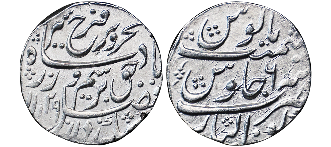 Farrukhsiyar (AH 1124-1131, 1713-1719 AD), Silver Rupee, 11.34 gms, Sholapur Mint, “Bahr-o-bar” Couplet, RY 7, Obv. Sikka zad az fazl-e-Haq bar sim-o-zar, Badshah Bahr-o-Barr Farukhsiyar, Rev. manus maimanat sanah julus zarb Sholapur, Unlisted, extremely fine, extremely rare. A Similar Specimen Sold in our past auctions for 1,00,000.