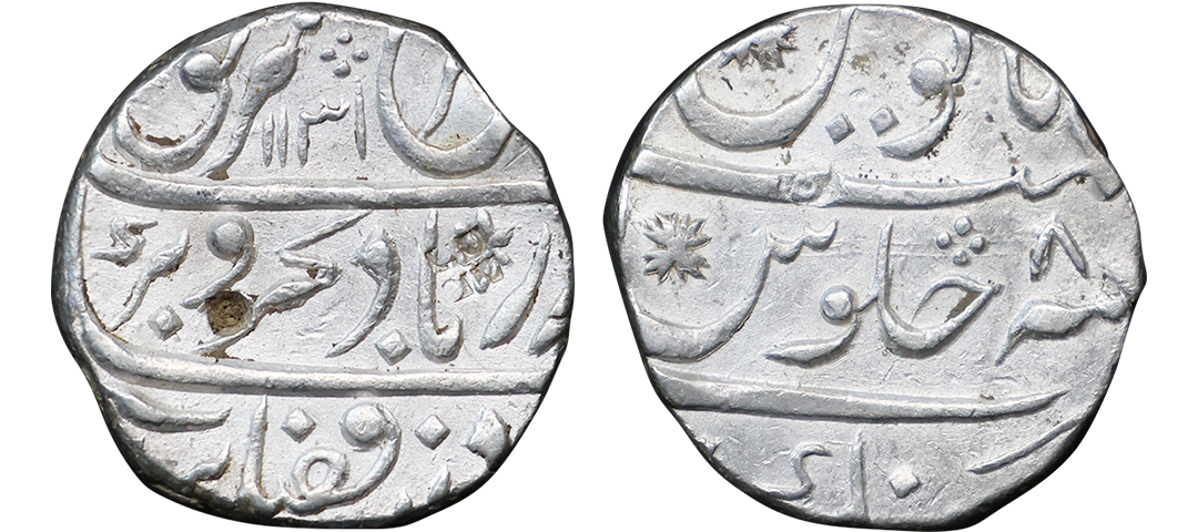 Farrukhsiyar (AH 1124-1131, 1713-1719 AD), Silver Rupee, 11.34 gms, Sholapur Mint, “Bahr-o-bar” Couplet, RY 7, Obv. Sikka zad az fazl-e-Haq bar sim-o-zar, Badshah Bahr-o-Barr Farukhsiyar, Rev. manus maimanat sanah julus zarb Sholapur, Unlisted, extremely fine, extremely rare. A Similar Specimen Sold in our past auctions for 1,00,000.