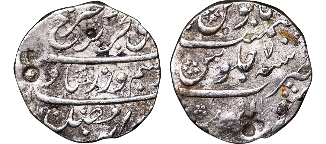 Farrukhsiyar (AH 1124-1131, 1713-1719 AD), Silver Rupee, 11.34 gms, Sholapur Mint, “Bahr-o-bar” Couplet, RY 7, Obv. Sikka zad az fazl-e-Haq bar sim-o-zar, Badshah Bahr-o-Barr Farukhsiyar, Rev. manus maimanat sanah julus zarb Sholapur, Unlisted, extremely fine, extremely rare. A Similar Specimen Sold in our past auctions for 1,00,000.