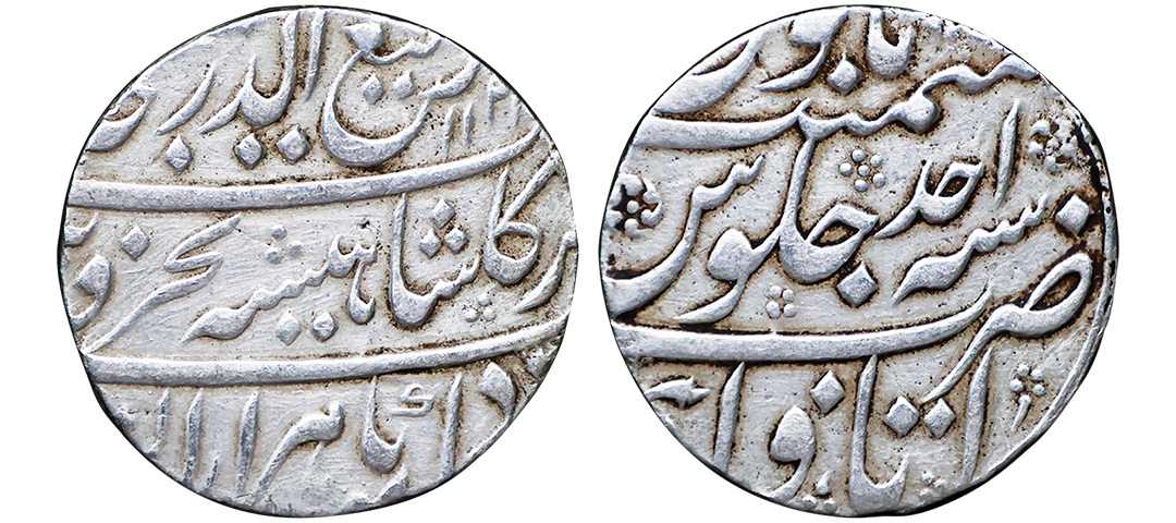 Farrukhsiyar (AH 1124-1131, 1713-1719 AD), Silver Rupee, 11.34 gms, Sholapur Mint, “Bahr-o-bar” Couplet, RY 7, Obv. Sikka zad az fazl-e-Haq bar sim-o-zar, Badshah Bahr-o-Barr Farukhsiyar, Rev. manus maimanat sanah julus zarb Sholapur, Unlisted, extremely fine, extremely rare. A Similar Specimen Sold in our past auctions for 1,00,000.
