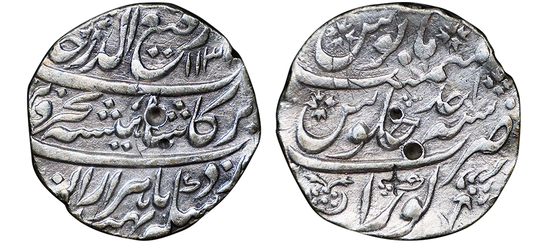 Farrukhsiyar (AH 1124-1131, 1713-1719 AD), Silver Rupee, 11.34 gms, Sholapur Mint, “Bahr-o-bar” Couplet, RY 7, Obv. Sikka zad az fazl-e-Haq bar sim-o-zar, Badshah Bahr-o-Barr Farukhsiyar, Rev. manus maimanat sanah julus zarb Sholapur, Unlisted, extremely fine, extremely rare. A Similar Specimen Sold in our past auctions for 1,00,000.