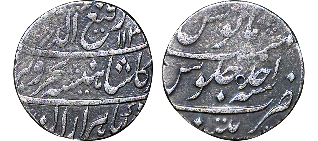 Farrukhsiyar (AH 1124-1131, 1713-1719 AD), Silver Rupee, 11.34 gms, Sholapur Mint, “Bahr-o-bar” Couplet, RY 7, Obv. Sikka zad az fazl-e-Haq bar sim-o-zar, Badshah Bahr-o-Barr Farukhsiyar, Rev. manus maimanat sanah julus zarb Sholapur, Unlisted, extremely fine, extremely rare. A Similar Specimen Sold in our past auctions for 1,00,000.