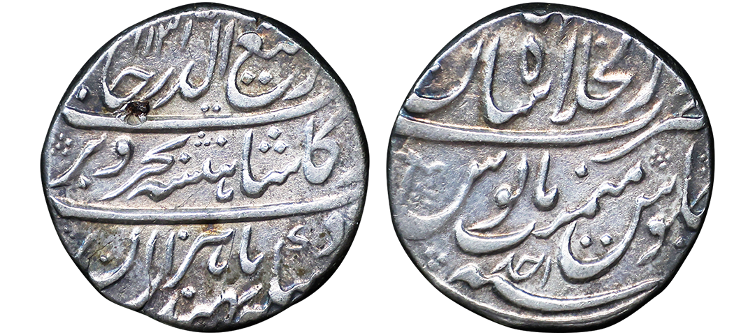 Farrukhsiyar (AH 1124-1131, 1713-1719 AD), Silver Rupee, 11.34 gms, Sholapur Mint, “Bahr-o-bar” Couplet, RY 7, Obv. Sikka zad az fazl-e-Haq bar sim-o-zar, Badshah Bahr-o-Barr Farukhsiyar, Rev. manus maimanat sanah julus zarb Sholapur, Unlisted, extremely fine, extremely rare. A Similar Specimen Sold in our past auctions for 1,00,000.