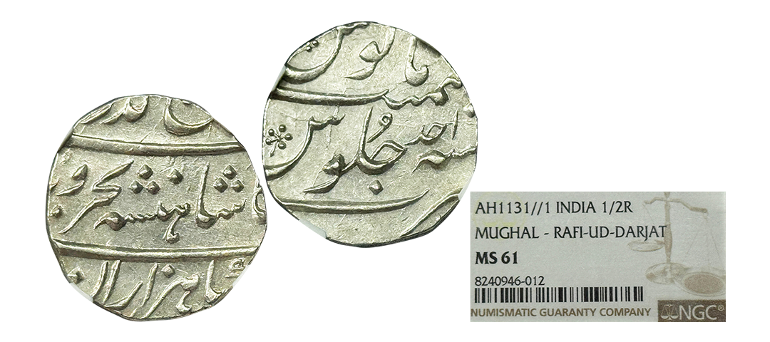 Rafi-ud-Darjat (AH 1131/1719 AD), Silver ½ Rupee, Surat Mint (by type), ‘Ba hazaran Barkat’ Couplet, Obv. sikka zad bahind bahazaraan barkaat, shahen shahe bahr-o-barr Rafi ud Darjat, Rev. manus maimanat sana julus zarb surat, KM #404.2, Graded by NGC as MS61, Top-Pop, extremely rare. Note: Fraction in Rafi-ud-Darjat are very rare, above specimen has a brilliant sharp strike with very high relief & pleasing lustre, Top-Pop(highest graded coin in NGC census).