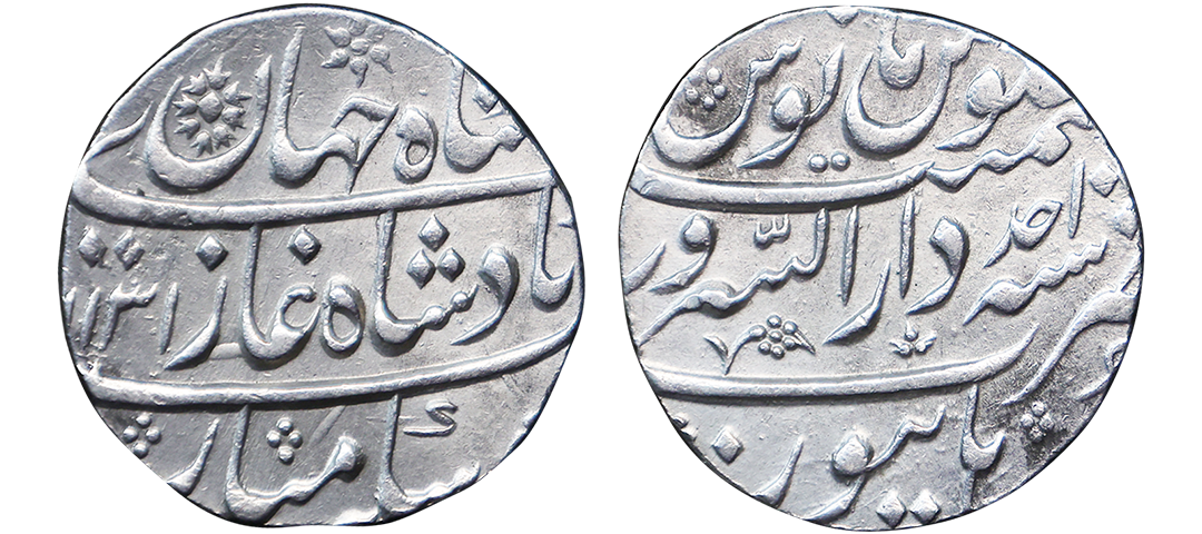 Farrukhsiyar (AH 1124-1131, 1713-1719 AD), Silver Rupee, 11.34 gms, Sholapur Mint, “Bahr-o-bar” Couplet, RY 7, Obv. Sikka zad az fazl-e-Haq bar sim-o-zar, Badshah Bahr-o-Barr Farukhsiyar, Rev. manus maimanat sanah julus zarb Sholapur, Unlisted, extremely fine, extremely rare. A Similar Specimen Sold in our past auctions for 1,00,000.