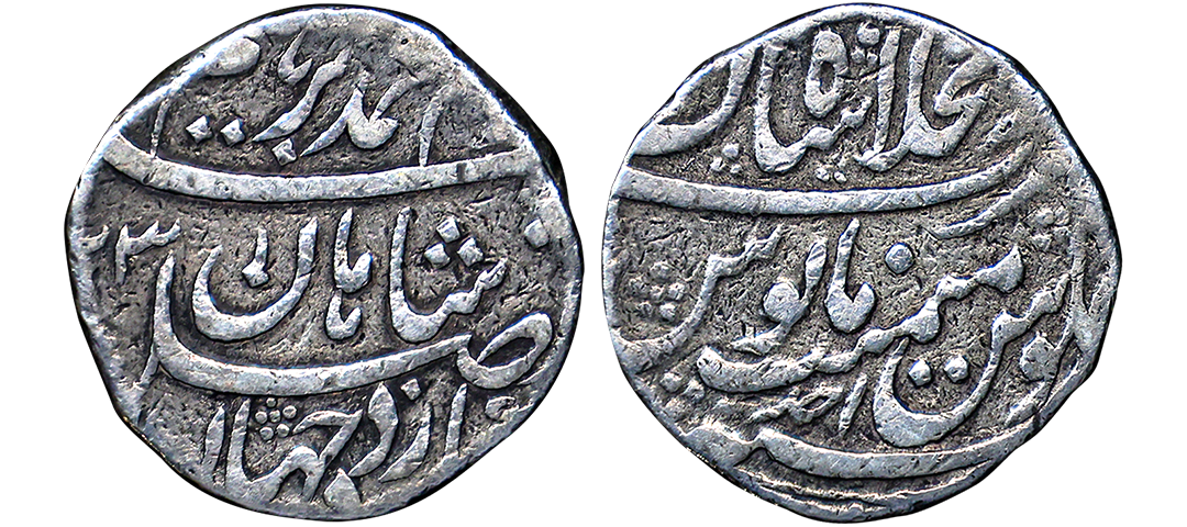 Farrukhsiyar (AH 1124-1131, 1713-1719 AD), Silver Rupee, 11.34 gms, Sholapur Mint, “Bahr-o-bar” Couplet, RY 7, Obv. Sikka zad az fazl-e-Haq bar sim-o-zar, Badshah Bahr-o-Barr Farukhsiyar, Rev. manus maimanat sanah julus zarb Sholapur, Unlisted, extremely fine, extremely rare. A Similar Specimen Sold in our past auctions for 1,00,000.