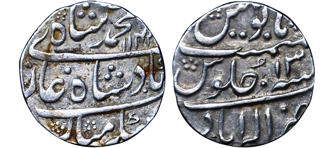 Farrukhsiyar (AH 1124-1131, 1713-1719 AD), Silver Rupee, 11.34 gms, Sholapur Mint, “Bahr-o-bar” Couplet, RY 7, Obv. Sikka zad az fazl-e-Haq bar sim-o-zar, Badshah Bahr-o-Barr Farukhsiyar, Rev. manus maimanat sanah julus zarb Sholapur, Unlisted, extremely fine, extremely rare. A Similar Specimen Sold in our past auctions for 1,00,000.