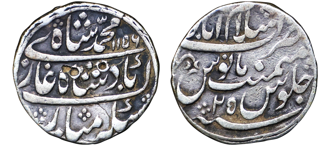 Farrukhsiyar (AH 1124-1131, 1713-1719 AD), Silver Rupee, 11.34 gms, Sholapur Mint, “Bahr-o-bar” Couplet, RY 7, Obv. Sikka zad az fazl-e-Haq bar sim-o-zar, Badshah Bahr-o-Barr Farukhsiyar, Rev. manus maimanat sanah julus zarb Sholapur, Unlisted, extremely fine, extremely rare. A Similar Specimen Sold in our past auctions for 1,00,000.