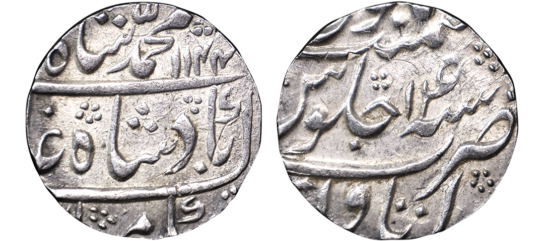 Farrukhsiyar (AH 1124-1131, 1713-1719 AD), Silver Rupee, 11.34 gms, Sholapur Mint, “Bahr-o-bar” Couplet, RY 7, Obv. Sikka zad az fazl-e-Haq bar sim-o-zar, Badshah Bahr-o-Barr Farukhsiyar, Rev. manus maimanat sanah julus zarb Sholapur, Unlisted, extremely fine, extremely rare. A Similar Specimen Sold in our past auctions for 1,00,000.