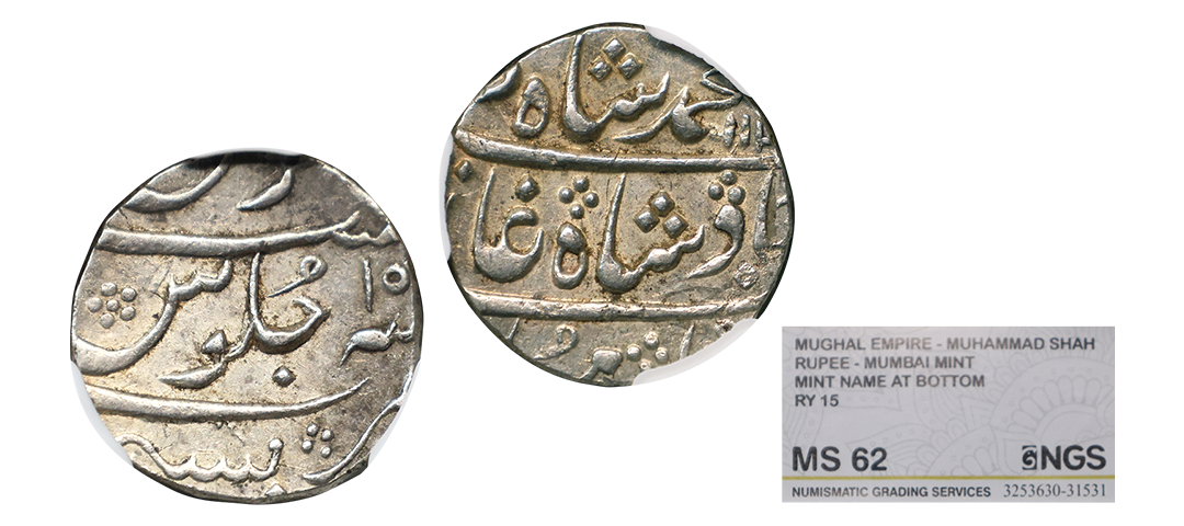 Rafi-ud-Darjat (AH 1131/1719 AD), Silver ½ Rupee, Surat Mint (by type), ‘Ba hazaran Barkat’ Couplet, Obv. sikka zad bahind bahazaraan barkaat, shahen shahe bahr-o-barr Rafi ud Darjat, Rev. manus maimanat sana julus zarb surat, KM #404.2, Graded by NGC as MS61, Top-Pop, extremely rare. Note: Fraction in Rafi-ud-Darjat are very rare, above specimen has a brilliant sharp strike with very high relief & pleasing lustre, Top-Pop(highest graded coin in NGC census).