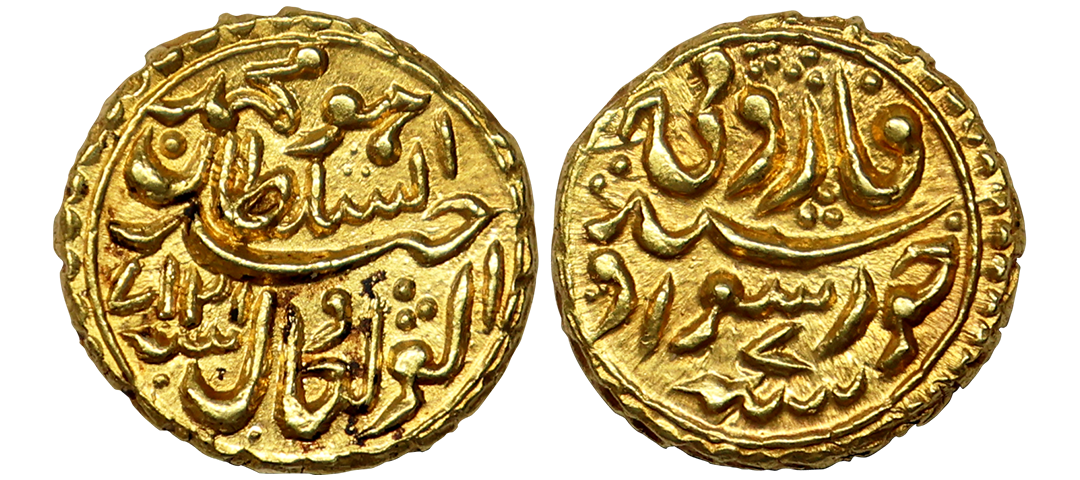 Mysore Tipu Sultan (AM 1215-1227, 1787-1799 AD), Gold Pagoda, 3.44 gms, Khurshed Sawad (Dharwar) Mint, AM 1217, RY 7, Obv: hu sultan ul-waheed al adil & Muhammad at the top, Rev: faruqi, Khurshed Sawad Mint & sana 7, KM # 99a, Uncirculated, very rare.