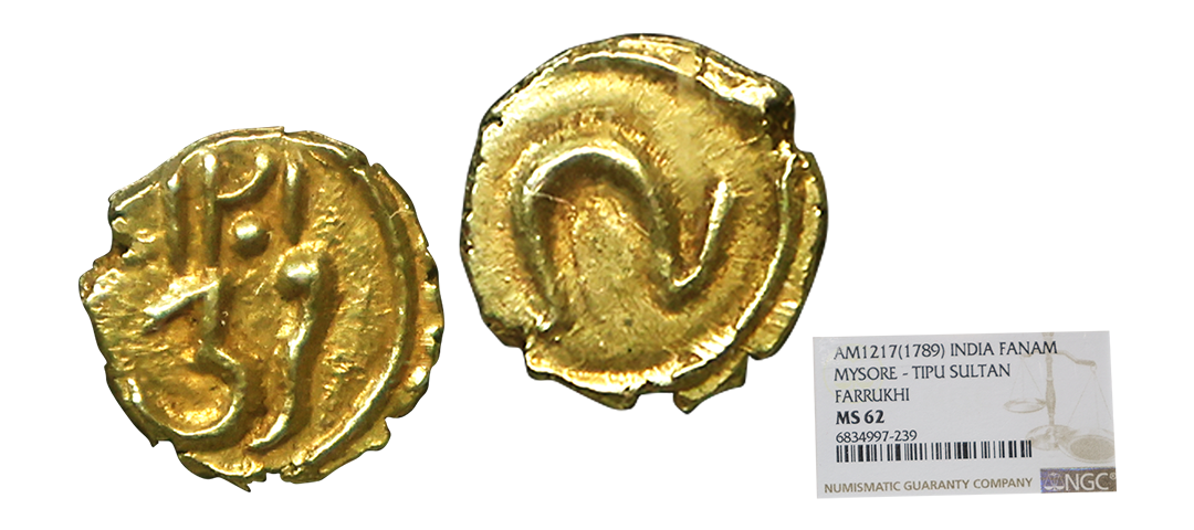 Mysore Tipu Sultan (AM 1215-1227, 1787-1799 AD), Gold Pagoda, 3.44 gms, Khurshed Sawad (Dharwar) Mint, AM 1217, RY 7, Obv: hu sultan ul-waheed al adil & Muhammad at the top, Rev: faruqi, Khurshed Sawad Mint & sana 7, KM # 99a, Uncirculated, very rare.