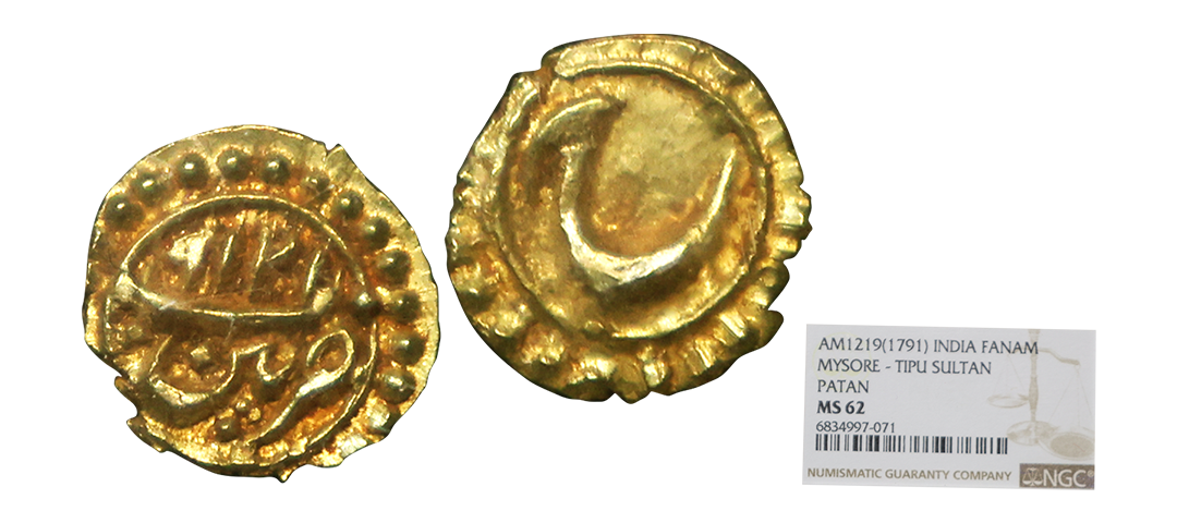 Mysore Tipu Sultan (AM 1215-1227, 1787-1799 AD), Gold Pagoda, 3.44 gms, Khurshed Sawad (Dharwar) Mint, AM 1217, RY 7, Obv: hu sultan ul-waheed al adil & Muhammad at the top, Rev: faruqi, Khurshed Sawad Mint & sana 7, KM # 99a, Uncirculated, very rare.