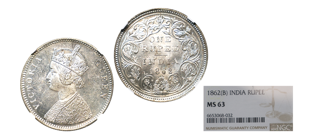 Victoria Queen, Silver Rupee, 1862, 0/4 Dot, Bombay Mint, graded by NGC MS63, Extremely rare in Grade.