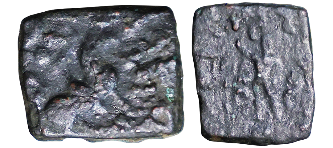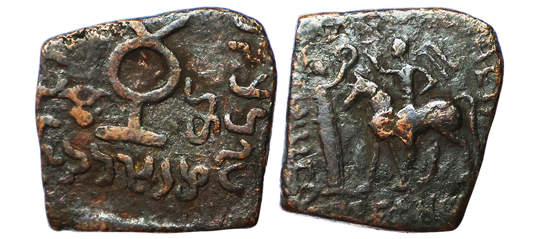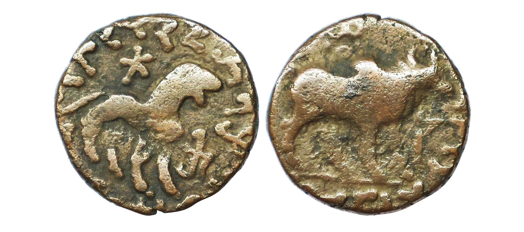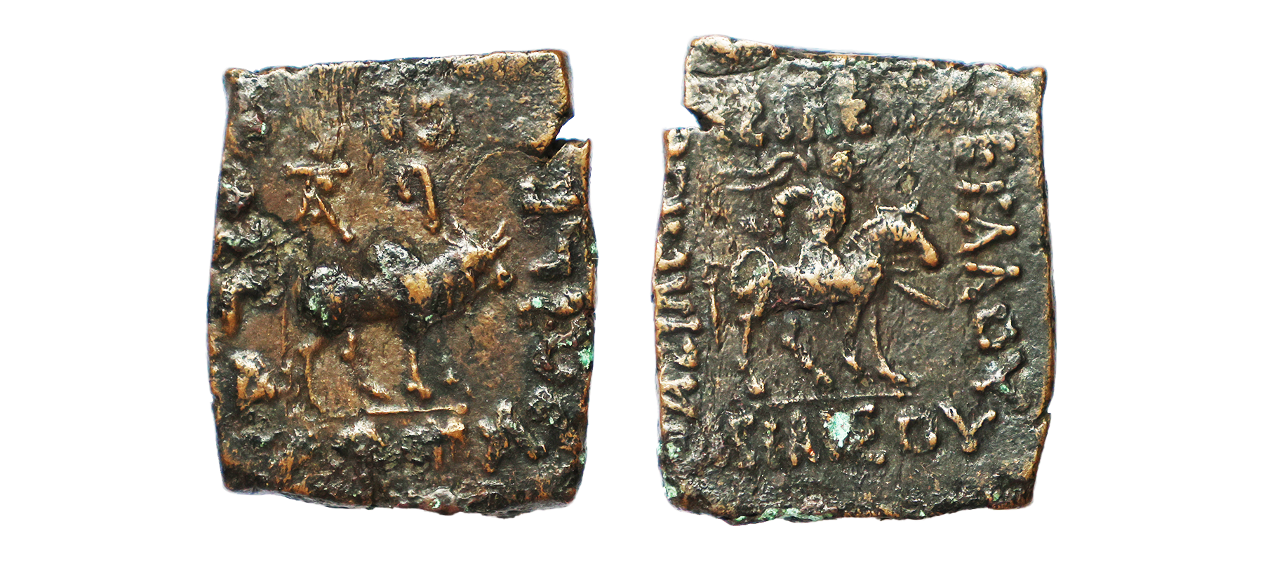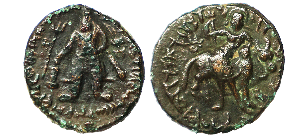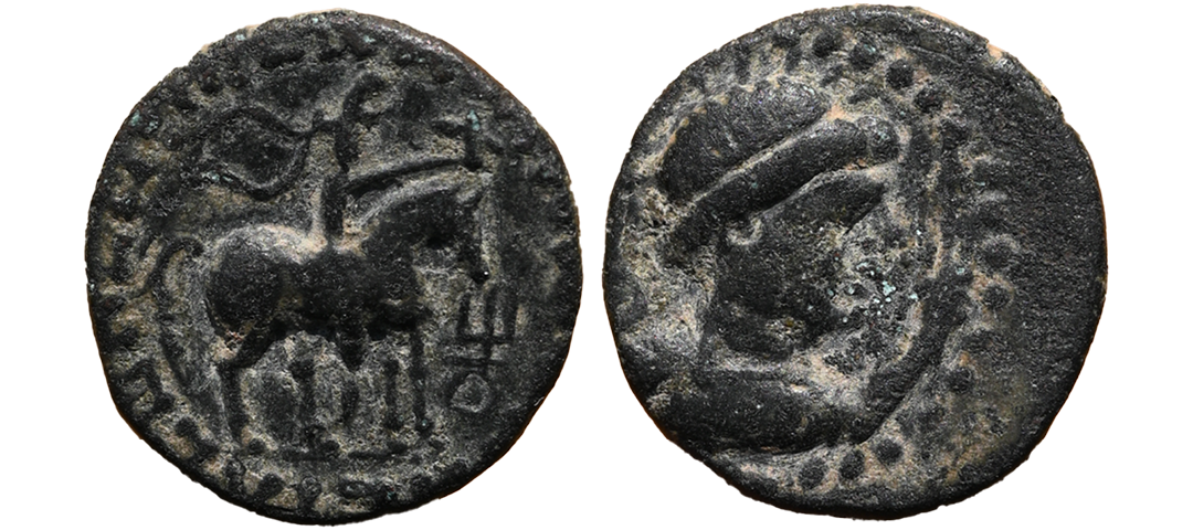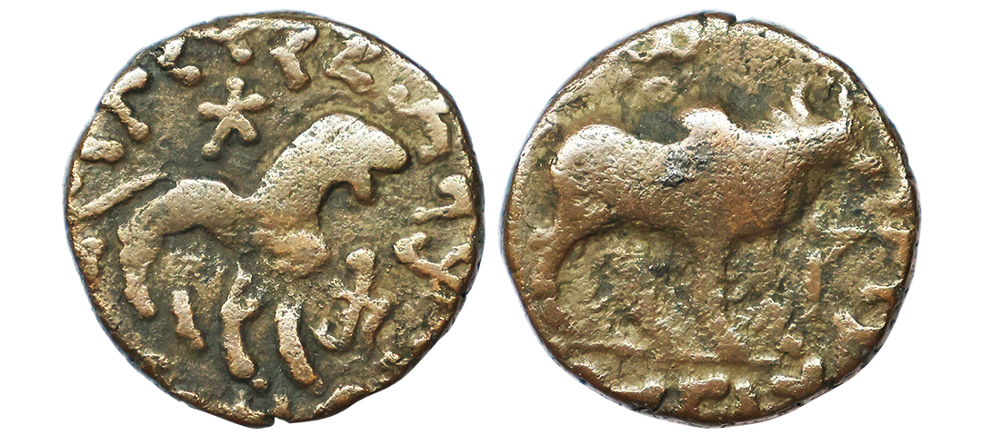Indo Scythians, Azilises (5-45/35 BC). Copper Unit, 11.54 gms, Obv. King riding on horse, holding spear, Greek legend ‘ΒΑΣΙΛΕΩΣ ΒΑCΙΛΕΩN ΜΕΓΑΛΟΥ AZIΛIΣOY’, Rev: bull to left, monograms above, Kharoshthi legend ‘Maharajasa Rajarajasa Mahatasa Ayilishasa’ partially visible, Senior #51.1, very fine, rare.