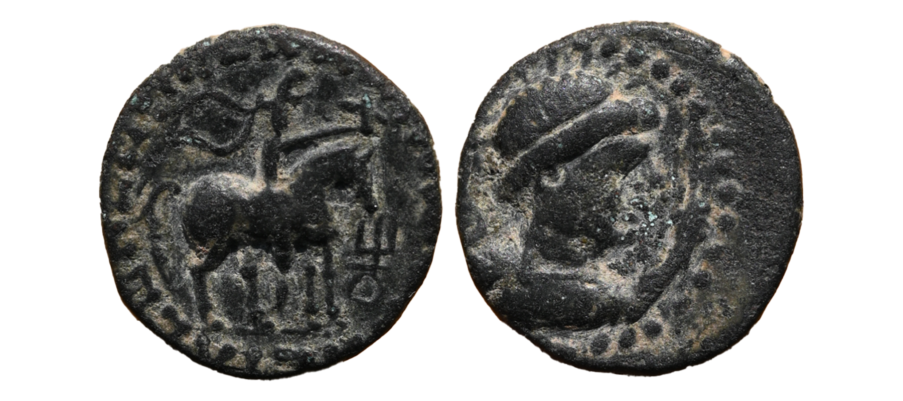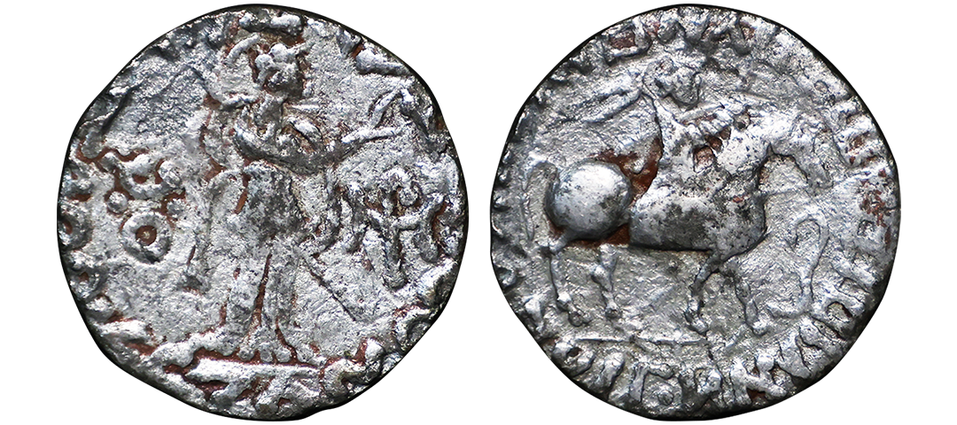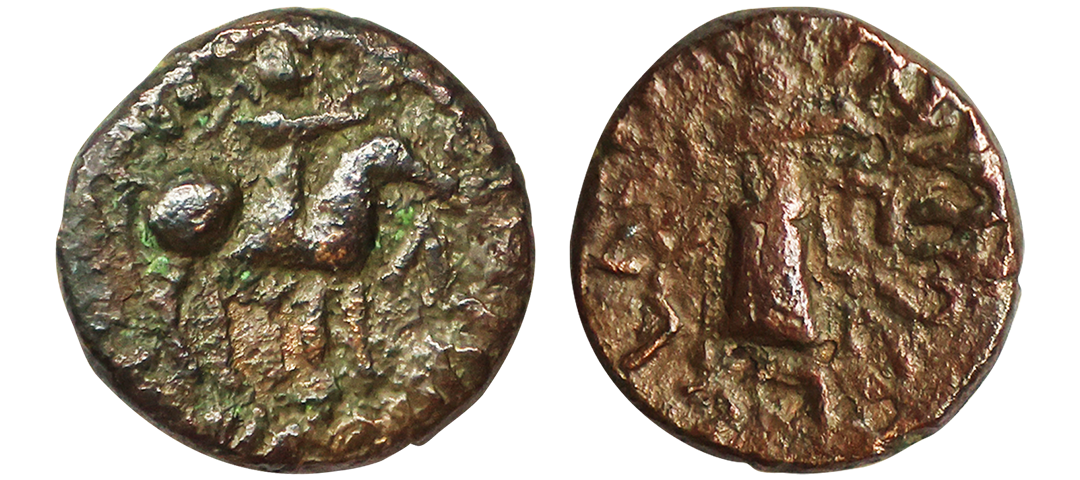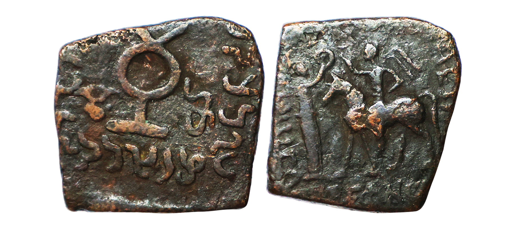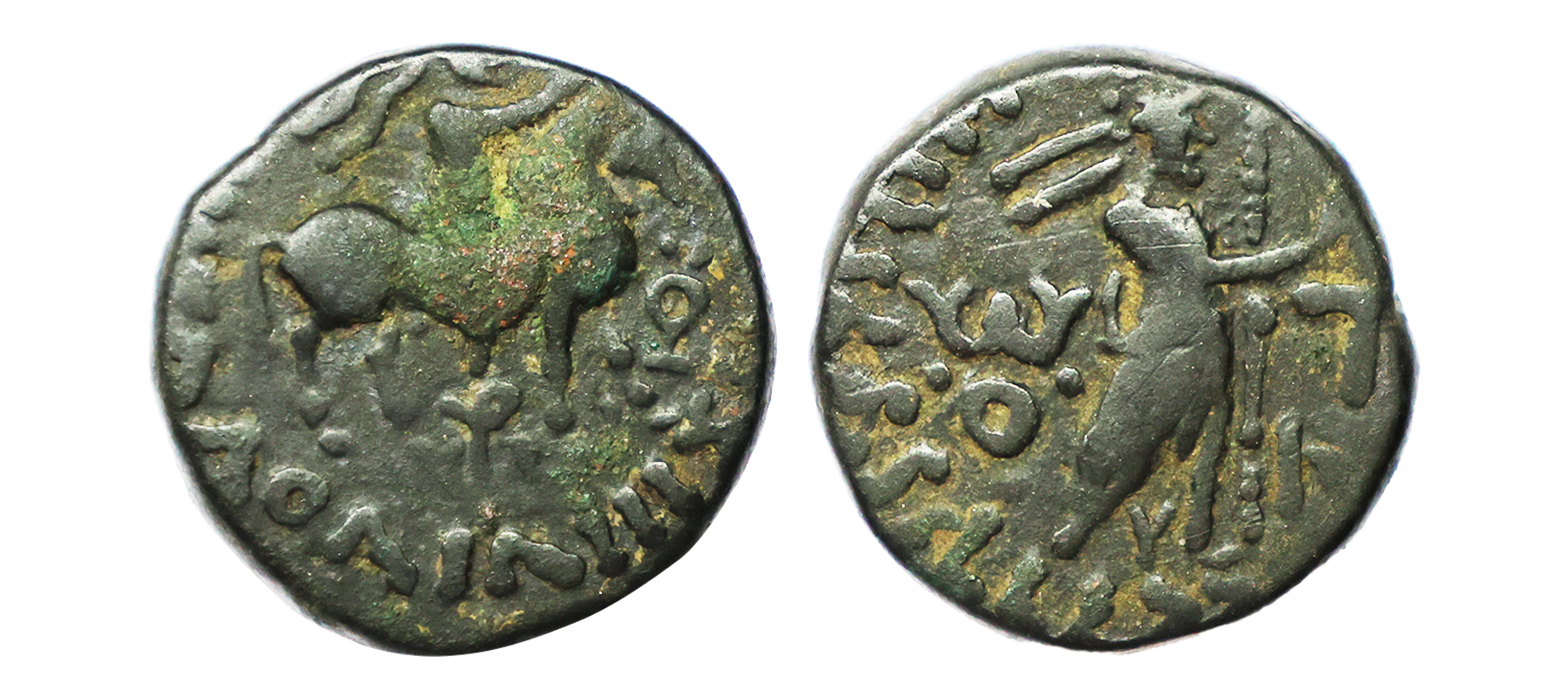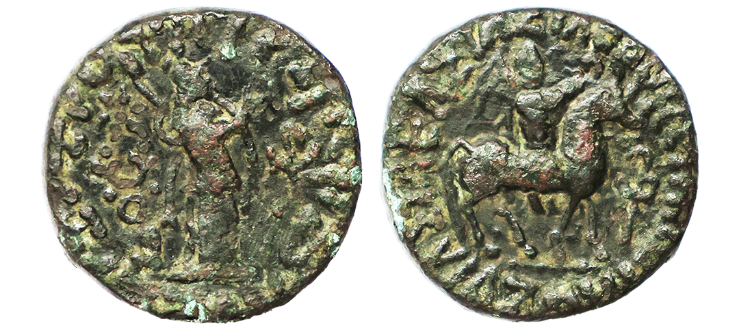 Indo Scythians, Azilises (5-45/35 BC). Copper Unit, 11.54 gms, Obv. King riding on horse, holding spear, Greek legend ‘ΒΑΣΙΛΕΩΣ ΒΑCΙΛΕΩN ΜΕΓΑΛΟΥ AZIΛIΣOY’, Rev: bull to left, monograms above, Kharoshthi legend ‘Maharajasa Rajarajasa Mahatasa Ayilishasa’ partially visible, Senior #51.1, very fine, rare.
