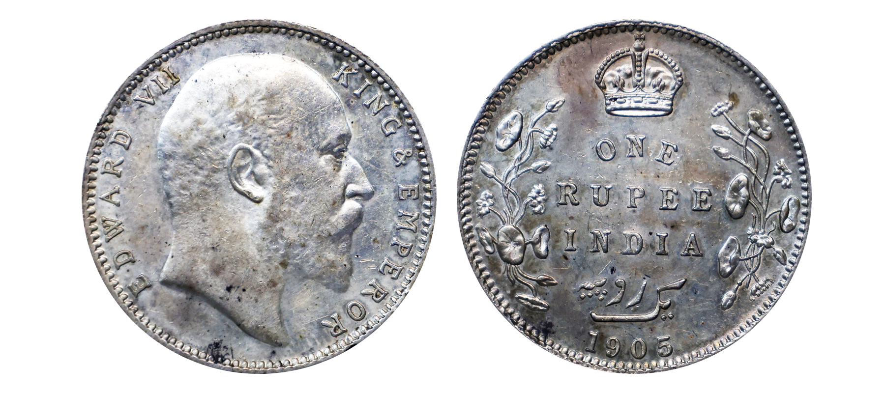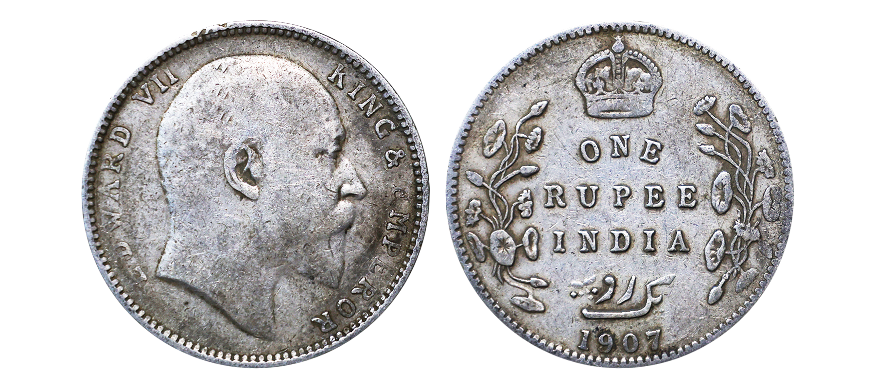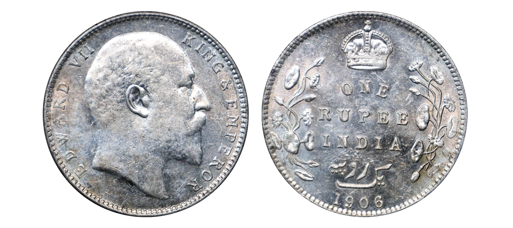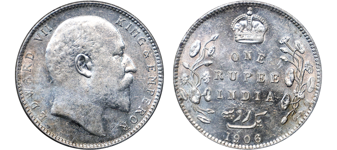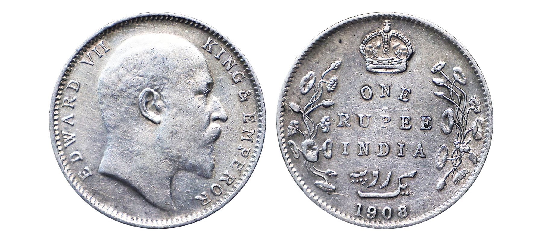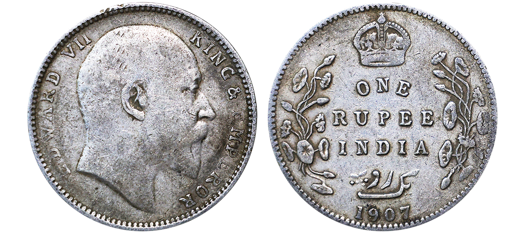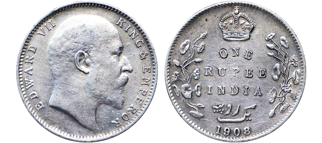Edward VII, Silver Rupee, 1908/7 overdate, Without b incuse at top and only dot on vine, very rare.