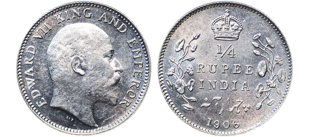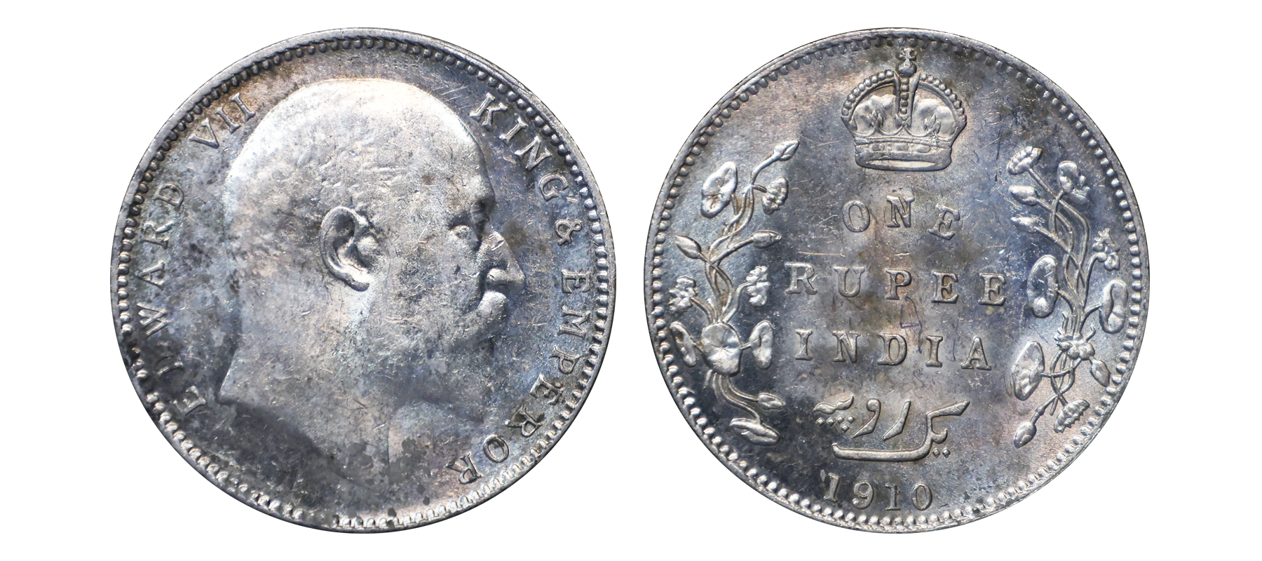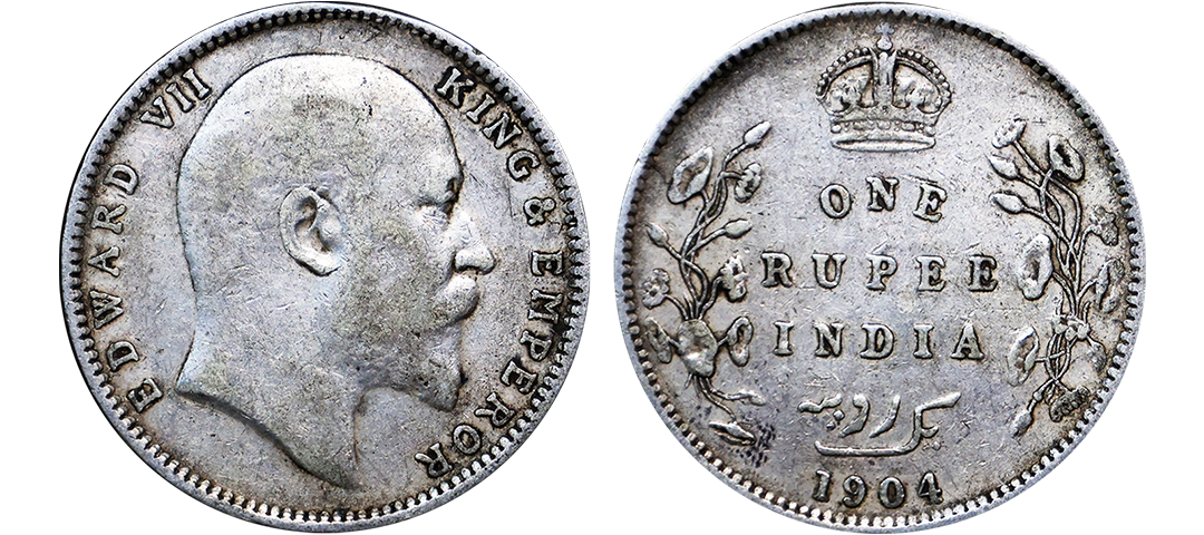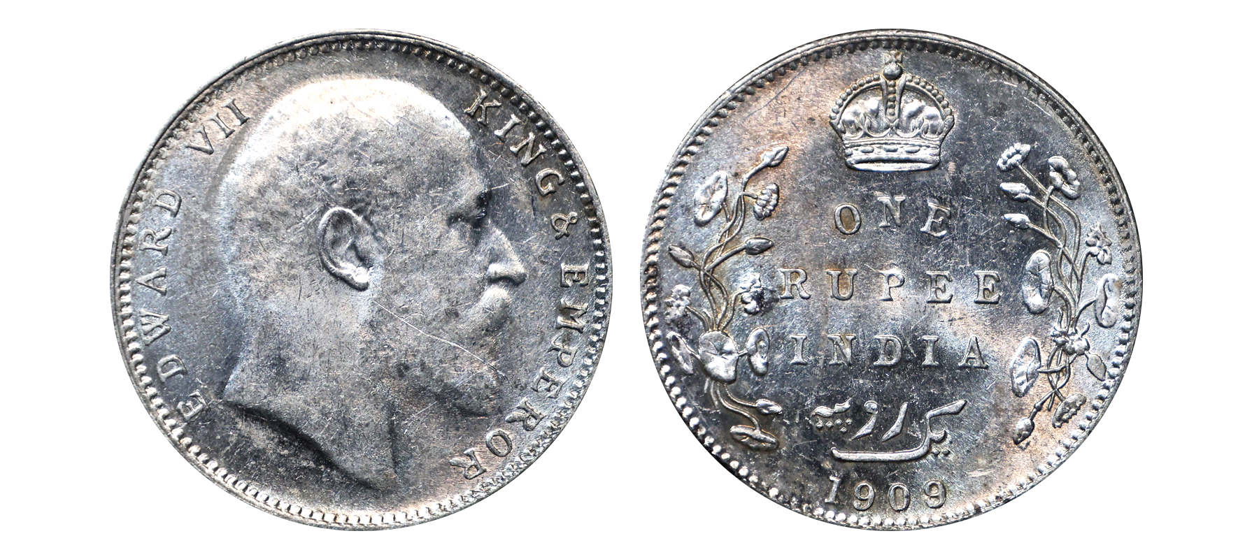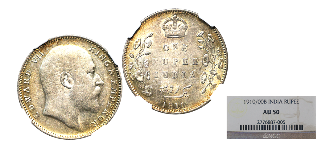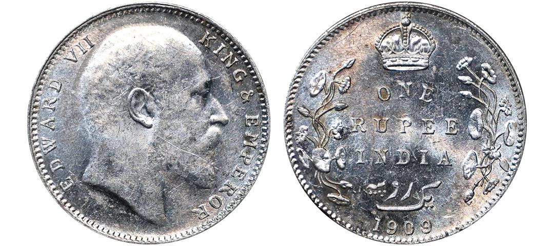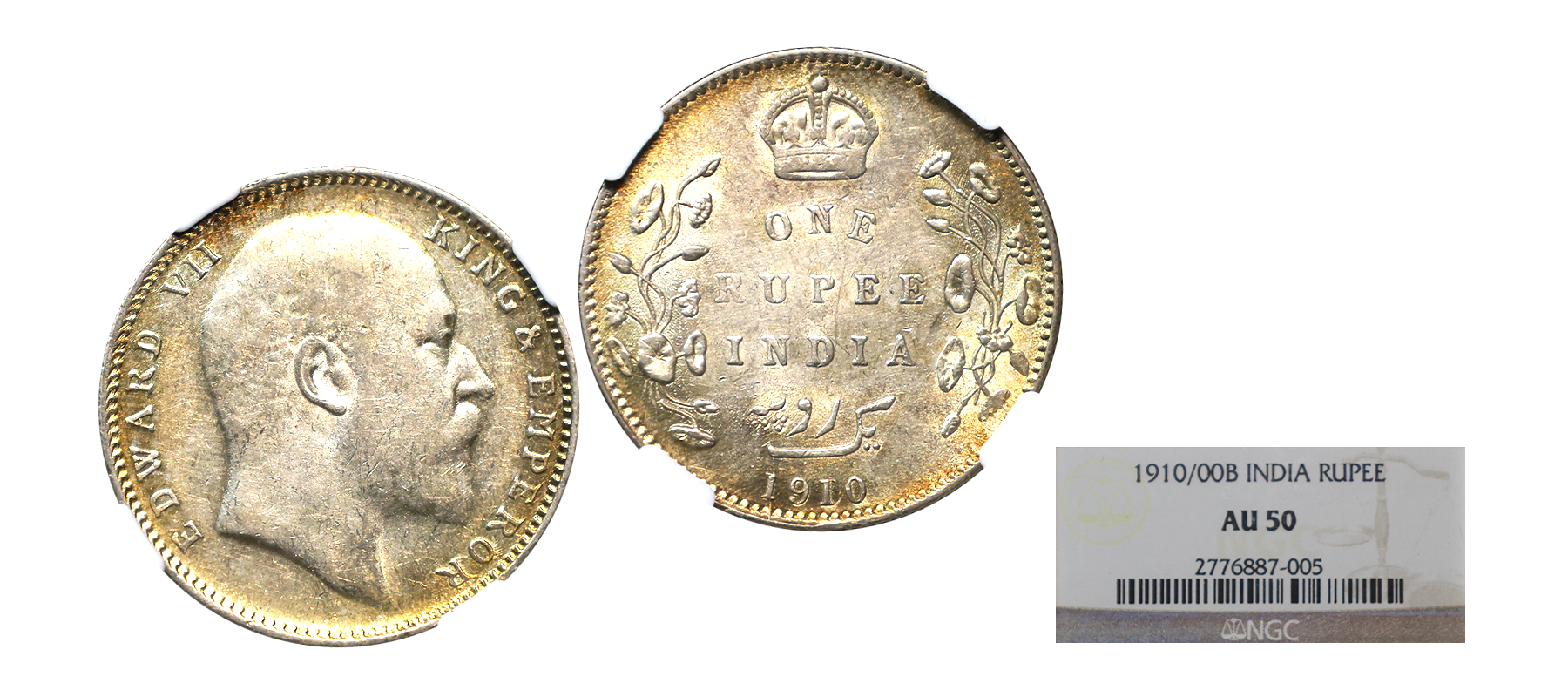 Edward VII, Silver Rupee, 1908/7 overdate, Without b incuse at top and only dot on vine, very rare.