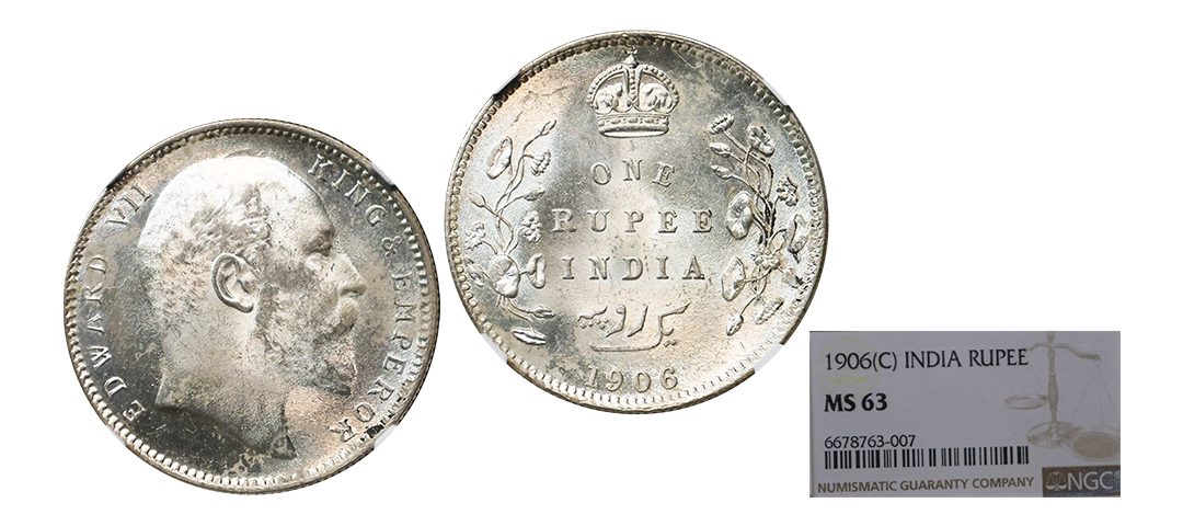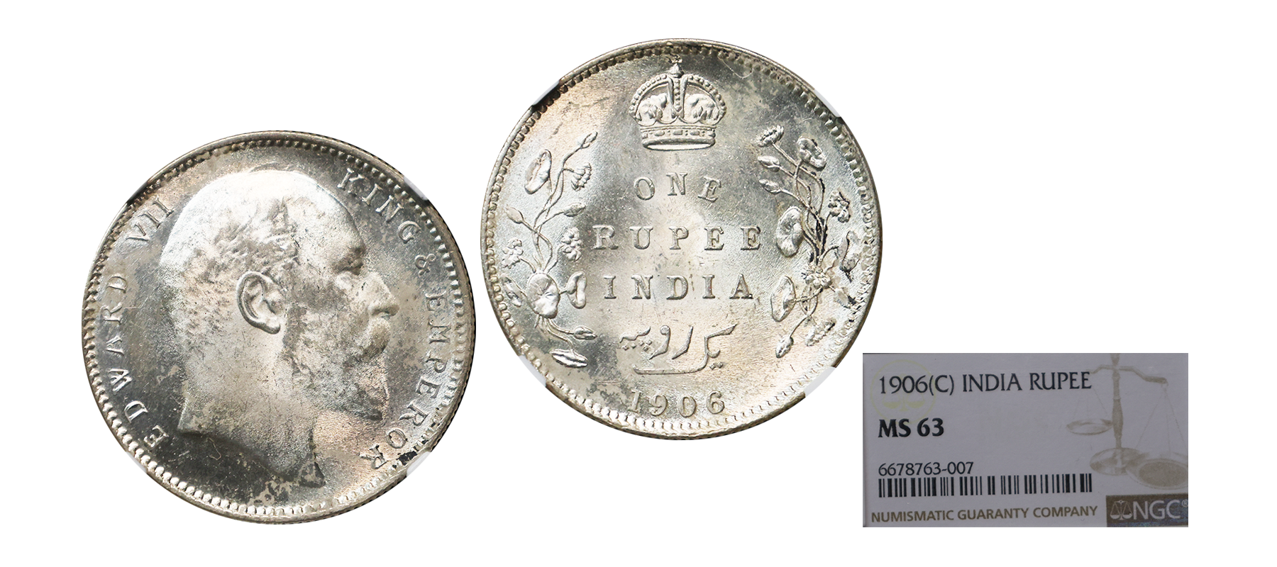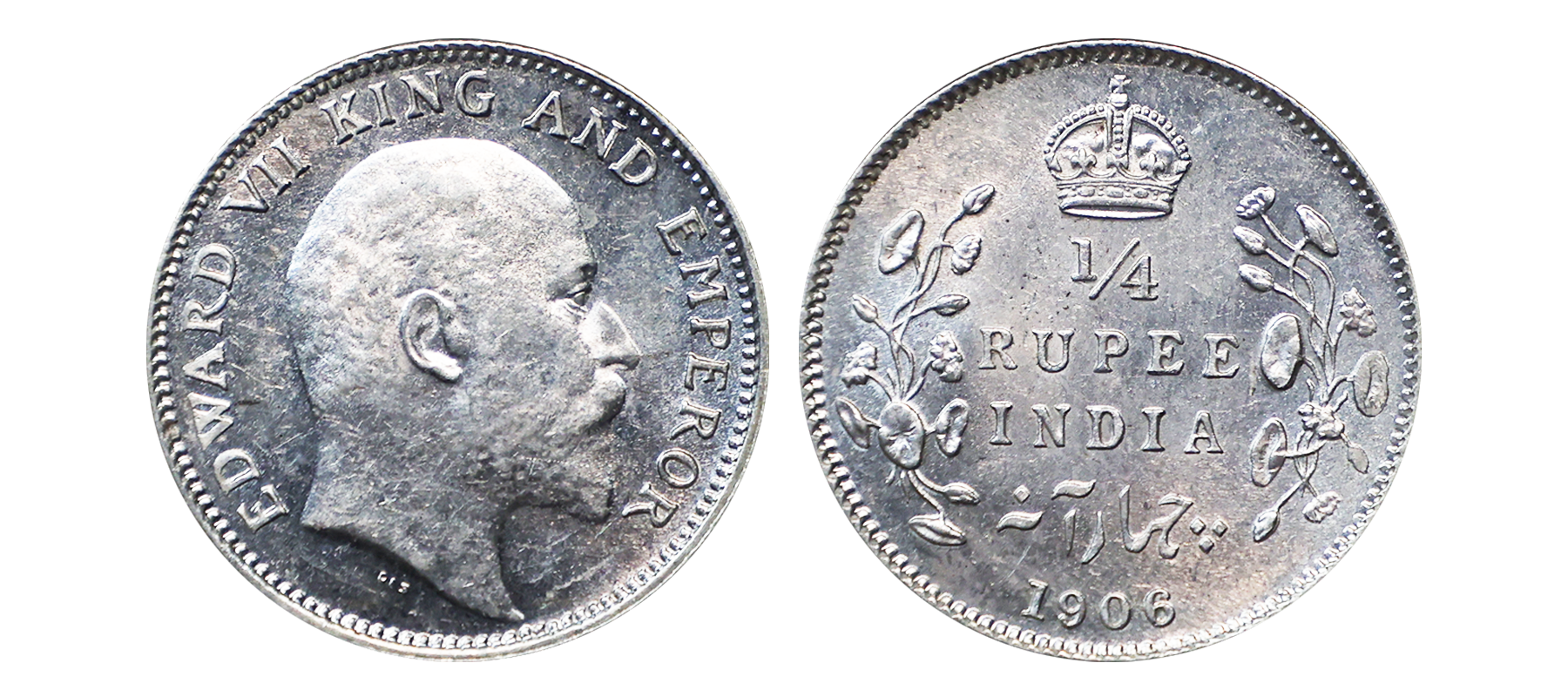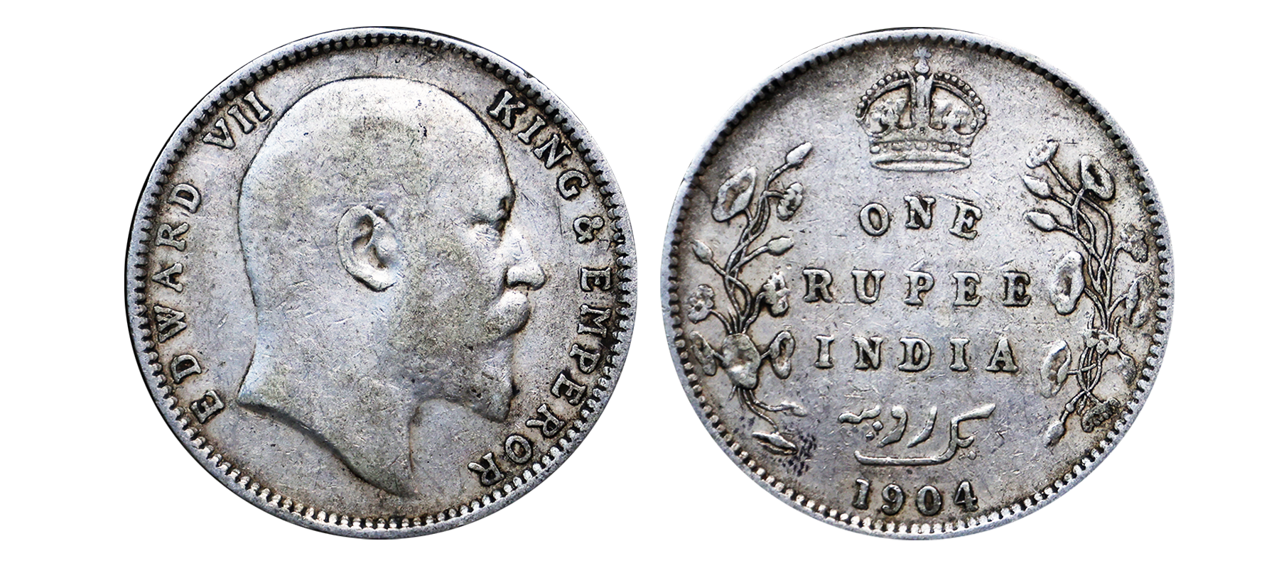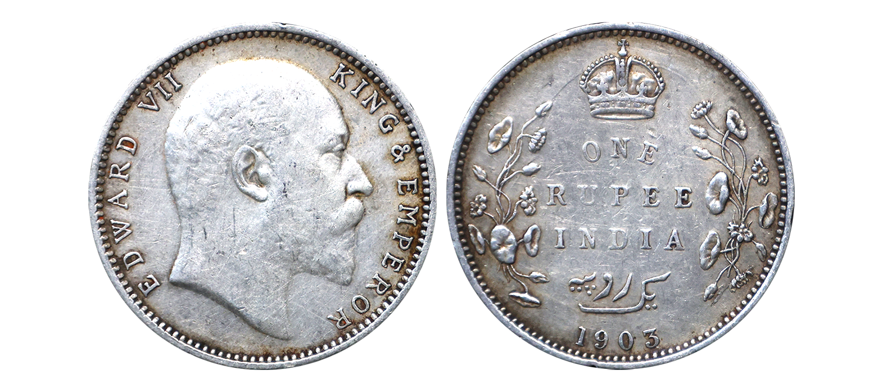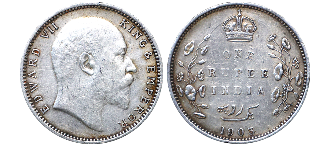 Edward VII, Silver Rupee, 1908/7 overdate, Without b incuse at top and only dot on vine, very rare.