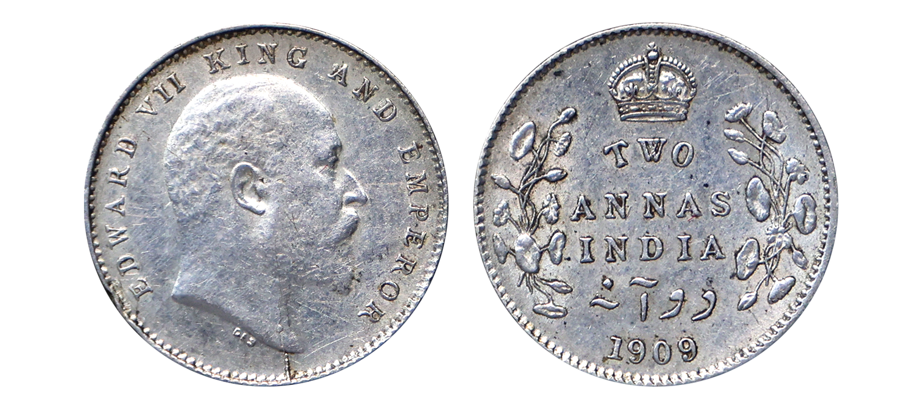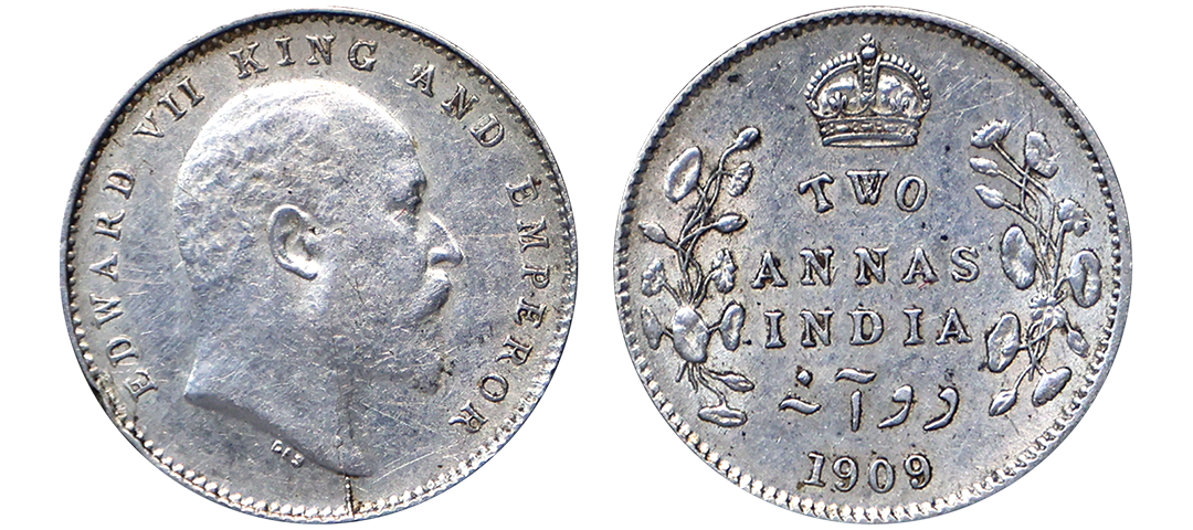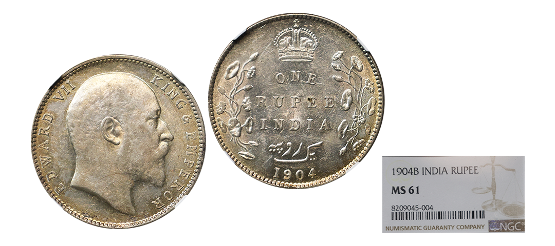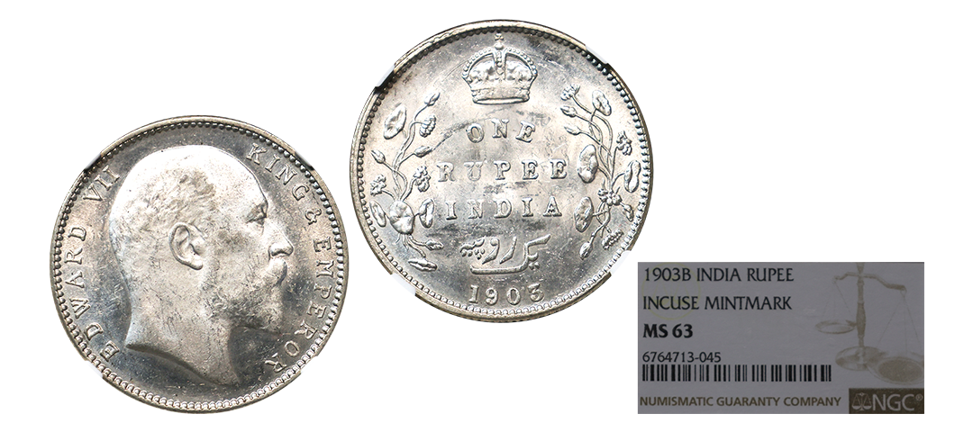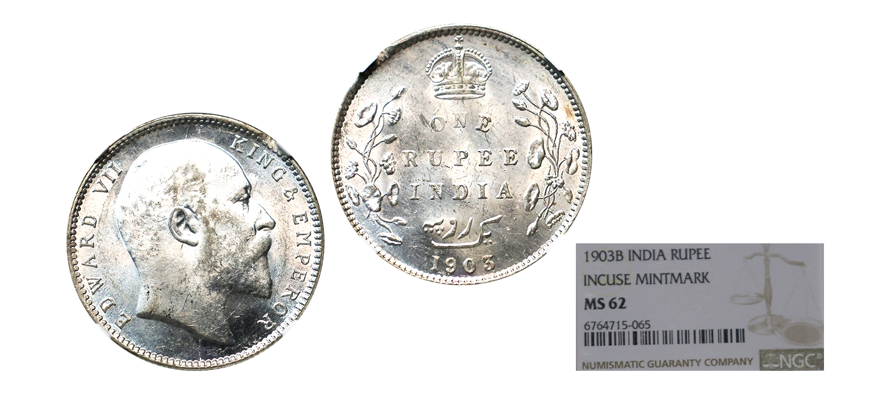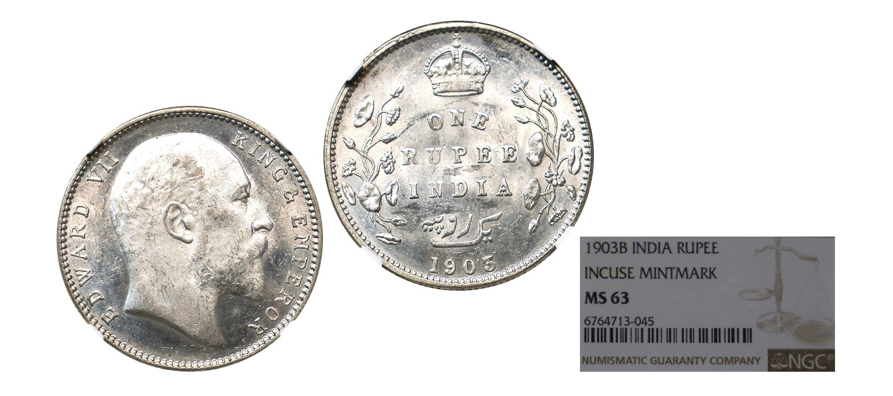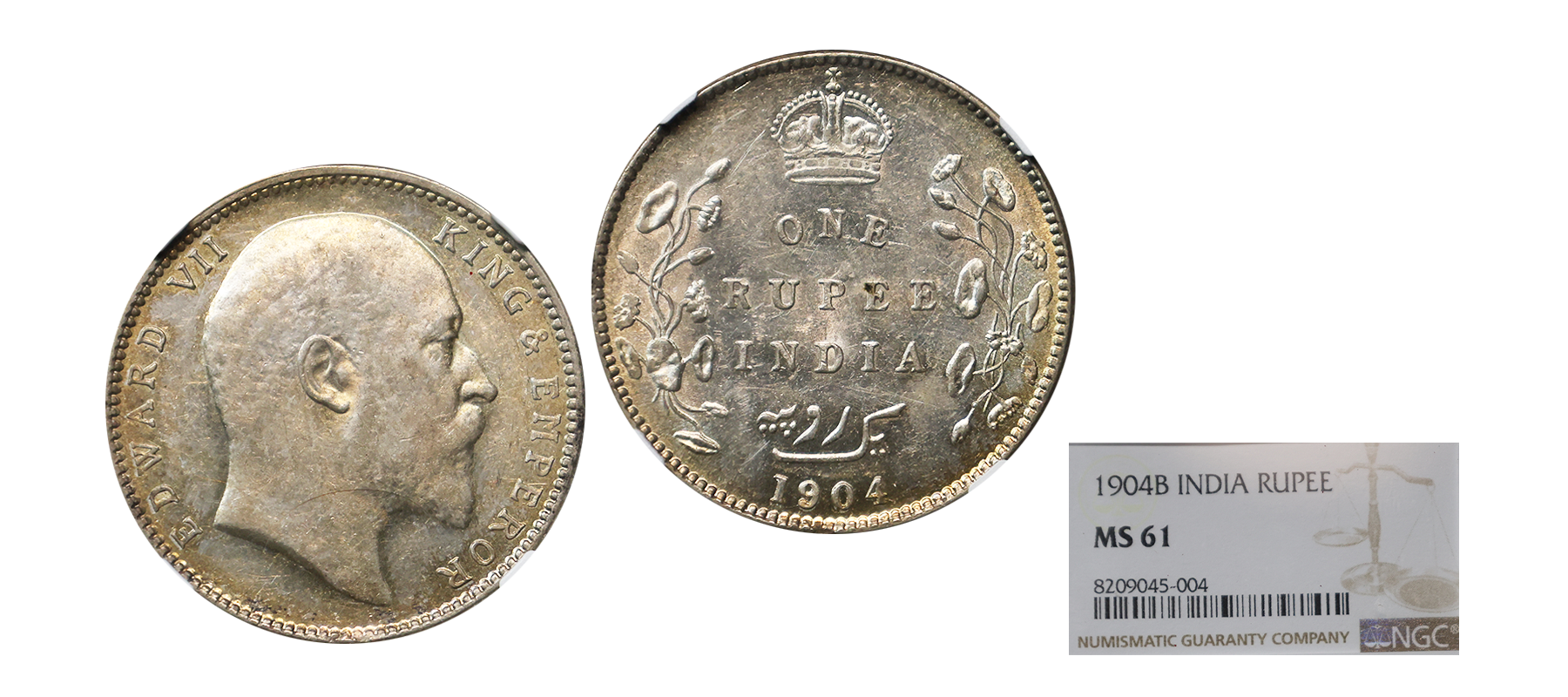 Edward VII, Silver Rupee, 1908/7 overdate, Without b incuse at top and only dot on vine, very rare.